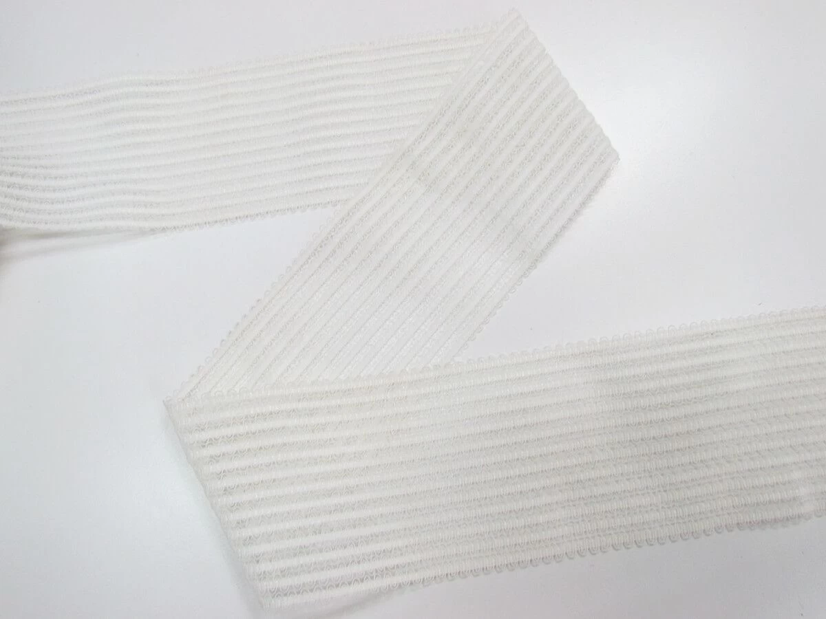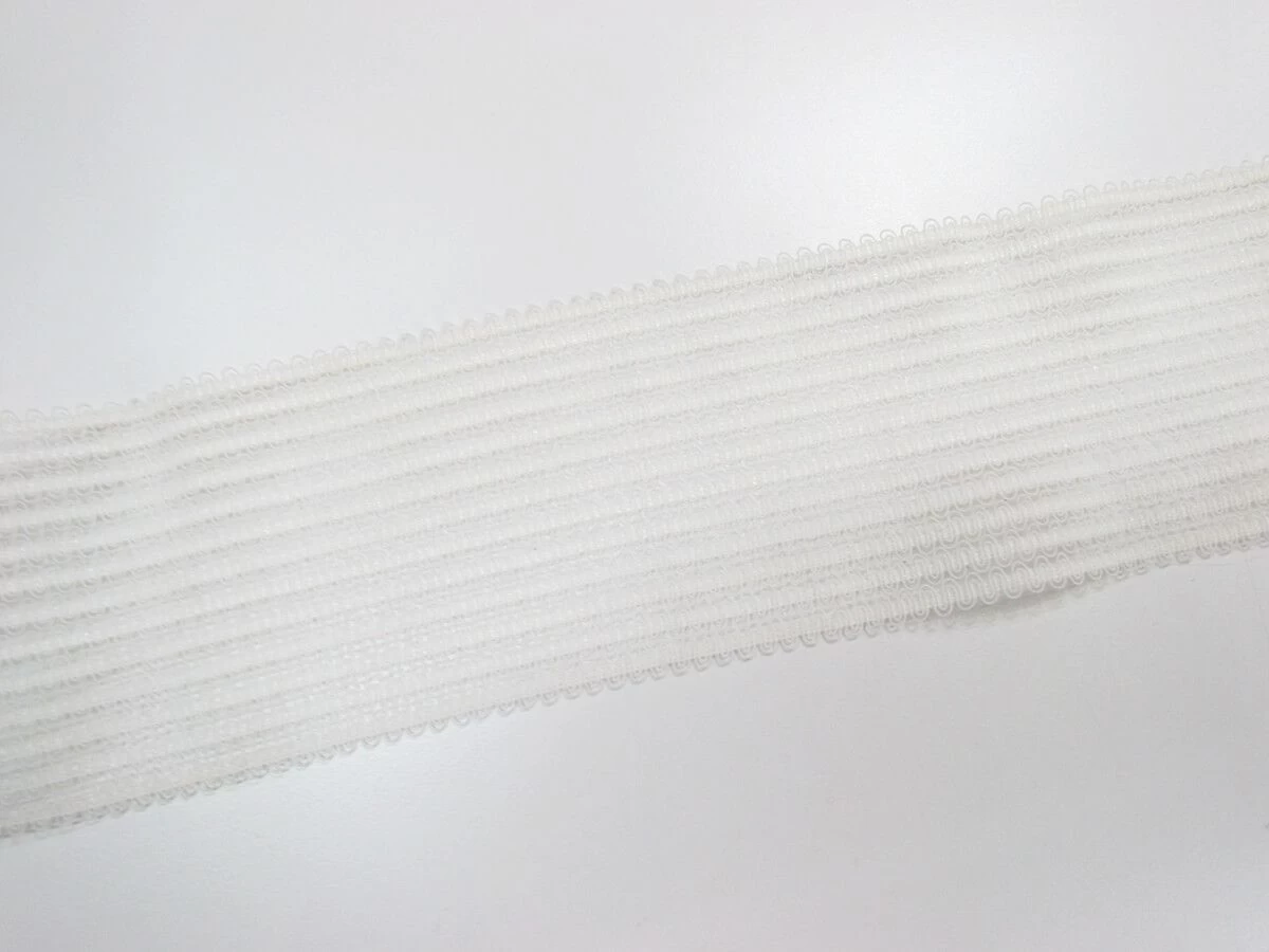 This elastic trim is approximately 100mm wide. It is made up of rows of elastic held togetehr with light invisible threads, giving a sheer appearance. It has good stretch and return and would be suitable for decorative use in waistbands, lingerie and other apparel or costume projects.