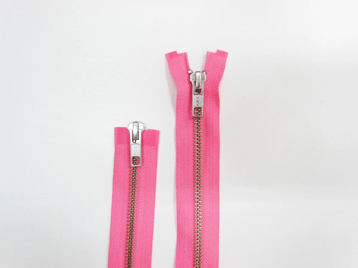 This open end zipper measures approximately 102cm in length and has two sliders, one staring on each end of the zipper. Although this zipper has two heads, it could easily be shortened and used as a one slider zip. This zipper has gold teeth and silver sliders and is perfect for adding to various craft, furnishing and apparel projects.
