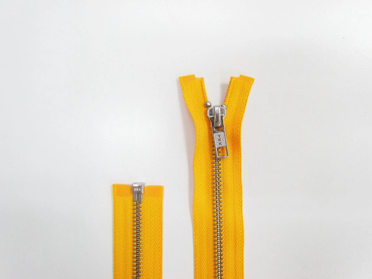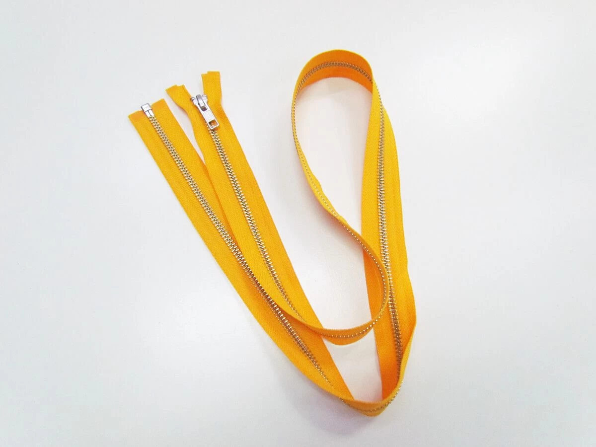 This open end zipper measures approximately 102cm in length and has one slider. This zipper has light gold teeth and silver sliders and is perfect for adding to various craft, furnishing and apparel projects. Even though this zipper measures 102cm in length, it could easily be shortened and used as a shorter, closed end zipper.