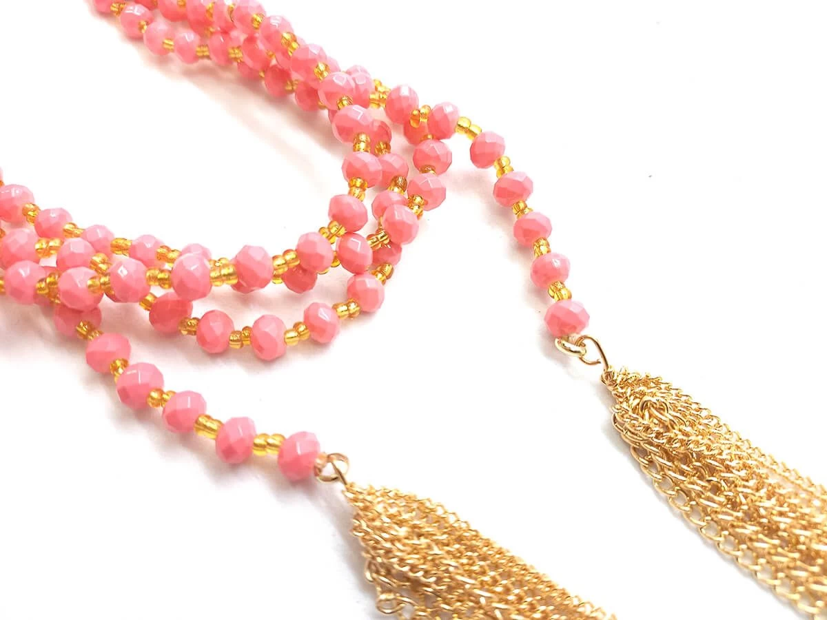 These beaded chains are approximately 122 cm long including the gold tassle ends. The pink beads are approximately 5 mm wide. They are relatively heavy. These chains can be used in a range of jewely, fashion and craft projects.