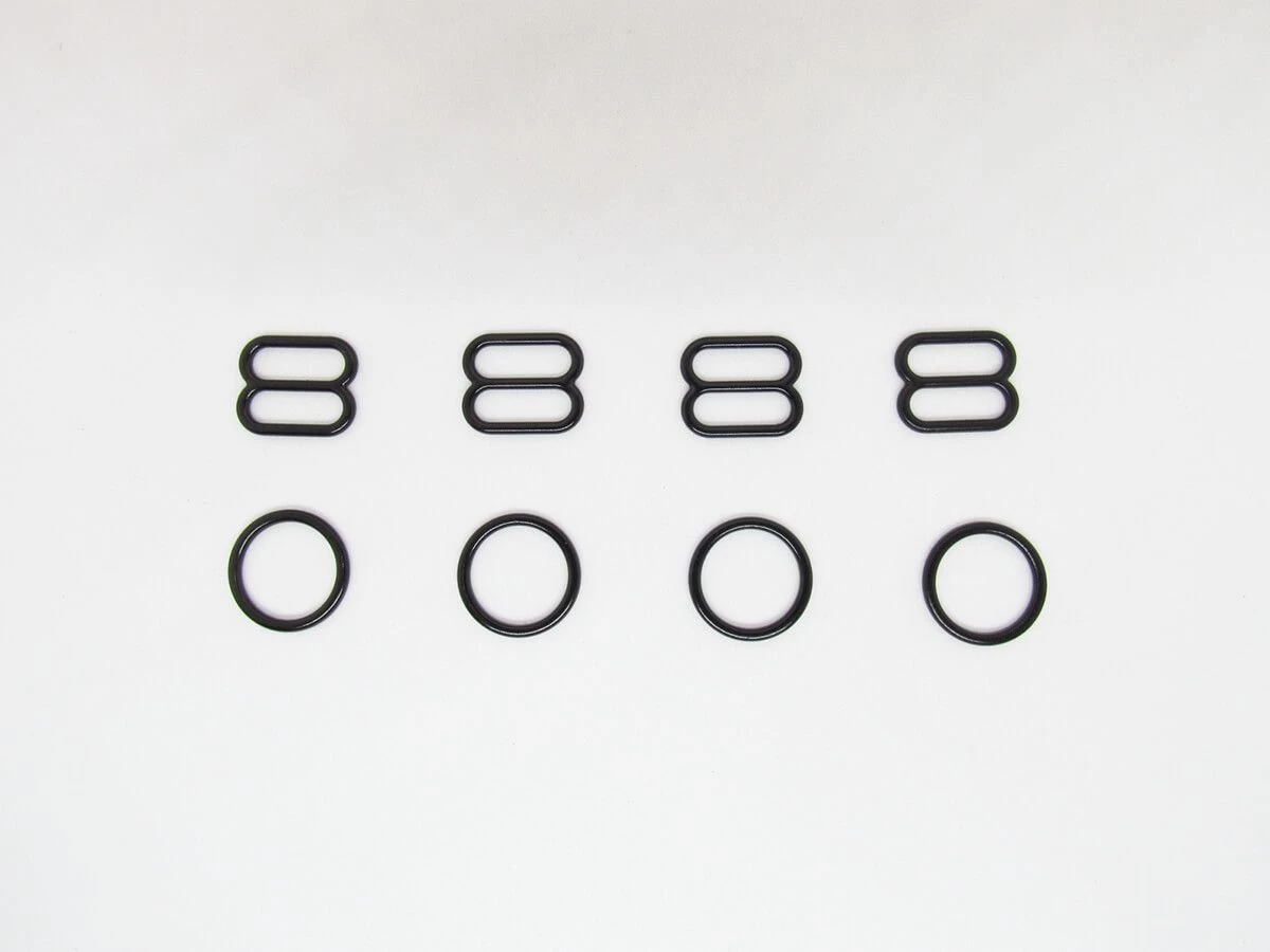 This matte black lingerie strap kit comes with eight pieces in total which is enough to make four individual straps. This kit comes with four rings and four sliders to make a 12mm adjustable lingerie strap.