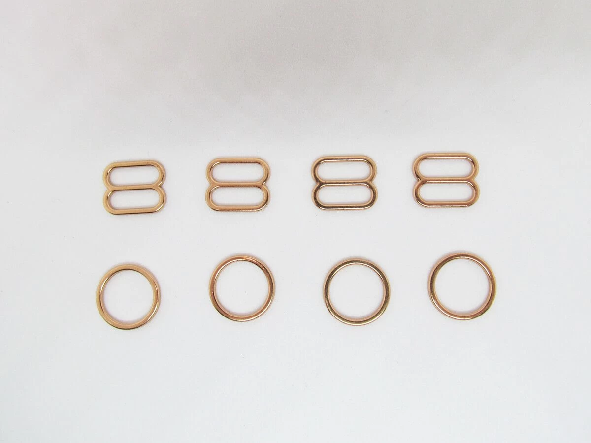 This rose gold lingerie strap kit comes with eight pieces in total which is enough to make four individual straps. This kit comes with four rings and four sliders to make a 12mm adjustable lingerie strap.