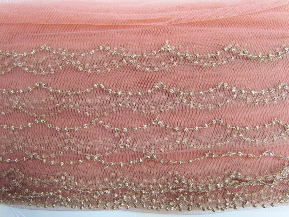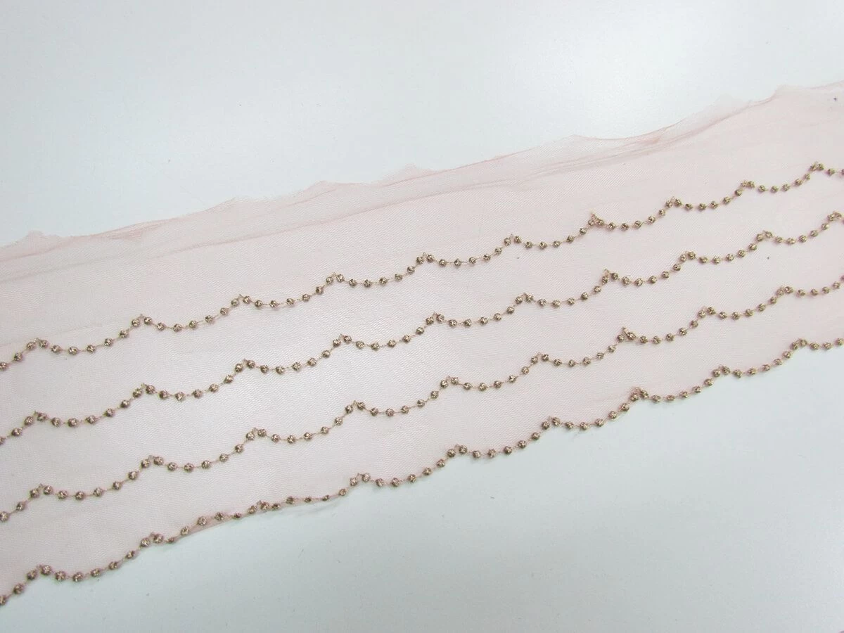 This 130mm tulle trim is made from nylon and features embroidered gold dots creating a scalloped pattern in four rows. This delicate trim is perfect for adding to apparel and costume applications.
