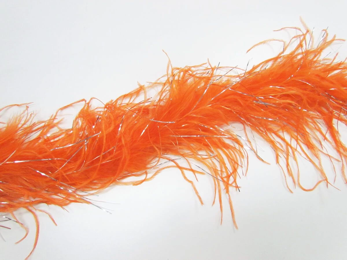 This feather boa trim is made from a combination of orange ostrich feathers, orange marabou feathers and silver lurex. These super soft ostrich feather boas have strands of tinsel looking lurex throughout, creating a shiny boa that looks amazing in the light. These feather boas have a length of at least 150cm per piece and when the feathers are smoothed down they have a diameter of approximately 25mm. These boas are perfect for various applications like adding to cuffs and hems of garments and costumes, craft applications or wearing on its own!