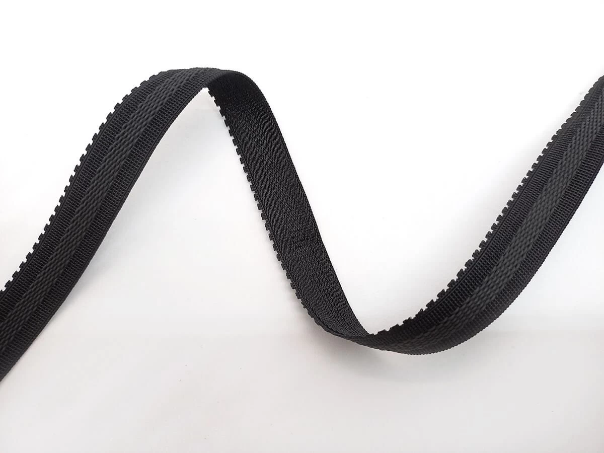 This 15mm black elastic has a rubber grip back, making it perfect for keeping garments in place. The grip is 5mm wide and sits in the centre of the elastic. It is ideal to sew along the upper edge fo strapless garments where the fabric is sewn directly onto the elastic, rather than making a channel and threading the elastic through the channel. It can also be used for bra straps or other applications where greater friction is needed.