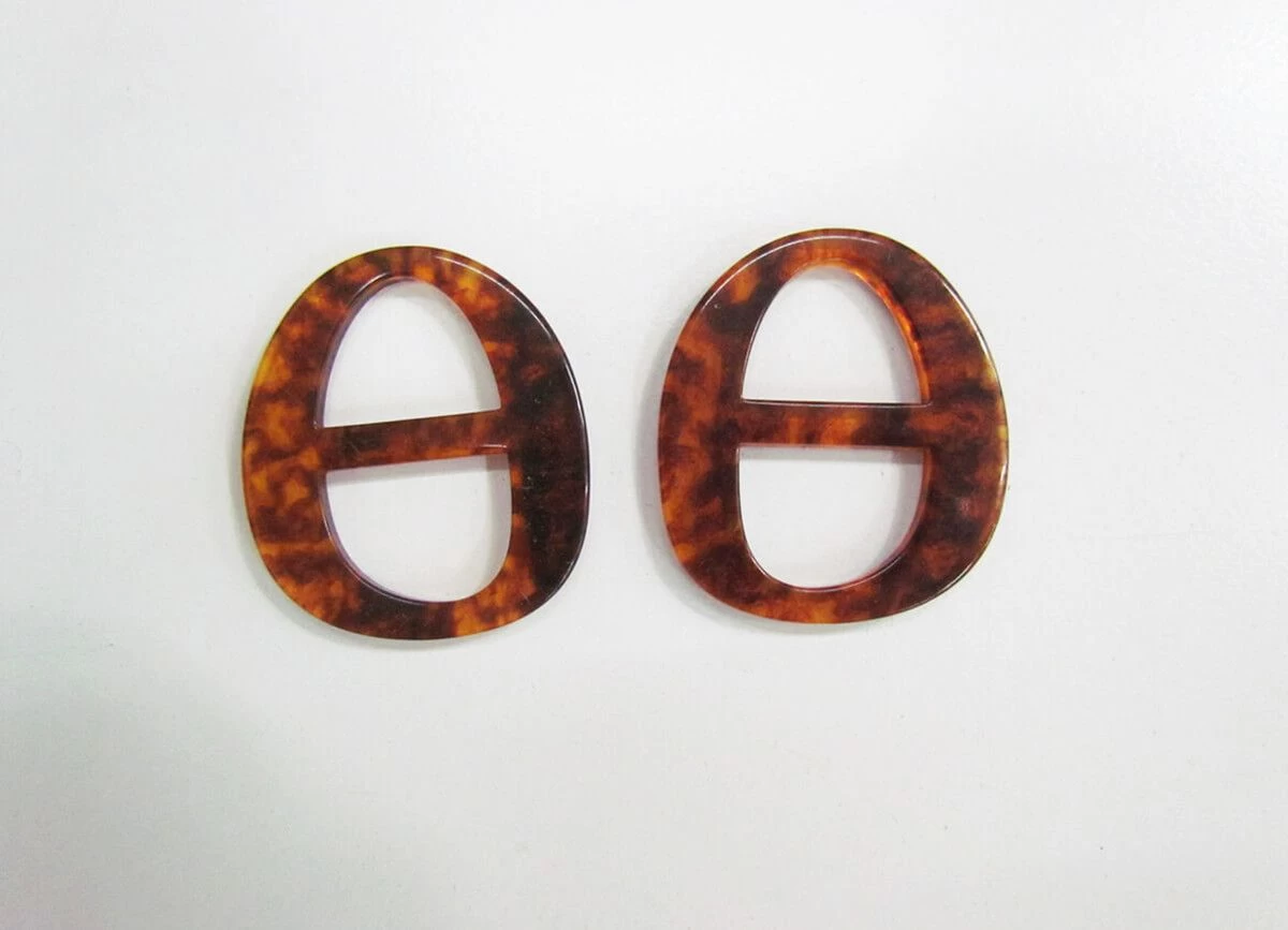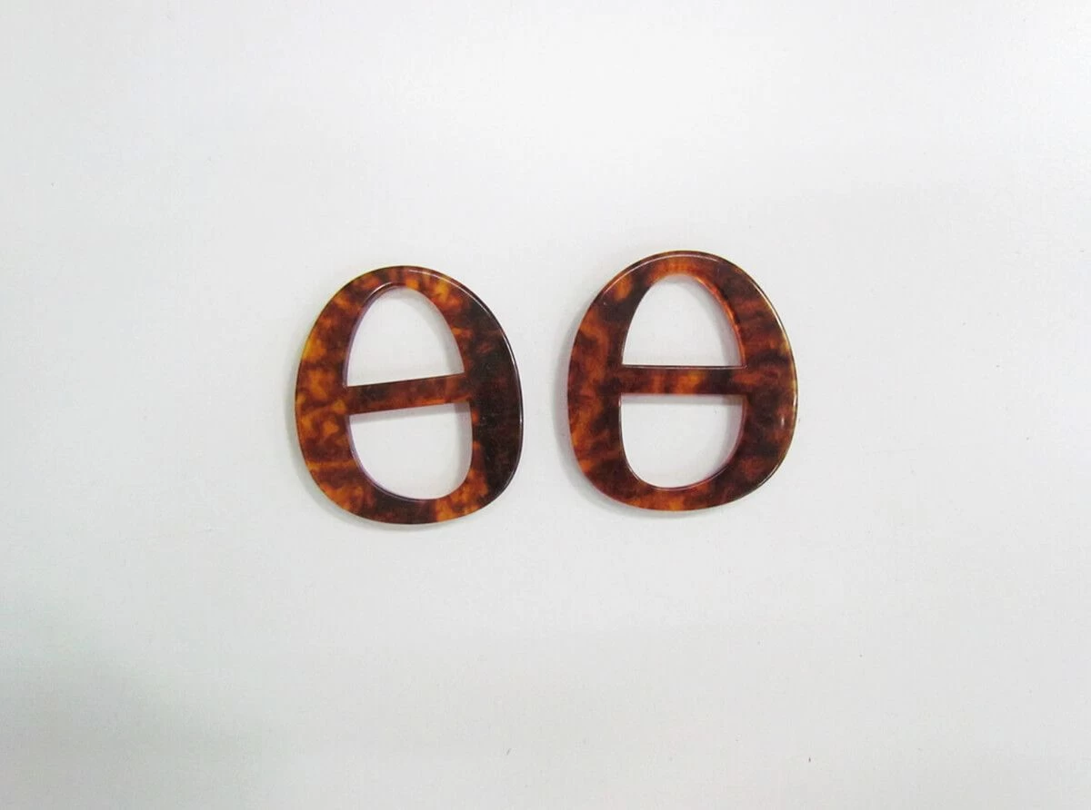 This buckle like accessory is approximately 40mm tall and 34mm wide. This buckle is lightweight, and a misty brown / tortoise shell look. This is a slider type buckle, through which belts, ties, or straps are threaded trough. This buckle will fit a maximum 18mm fabric width.