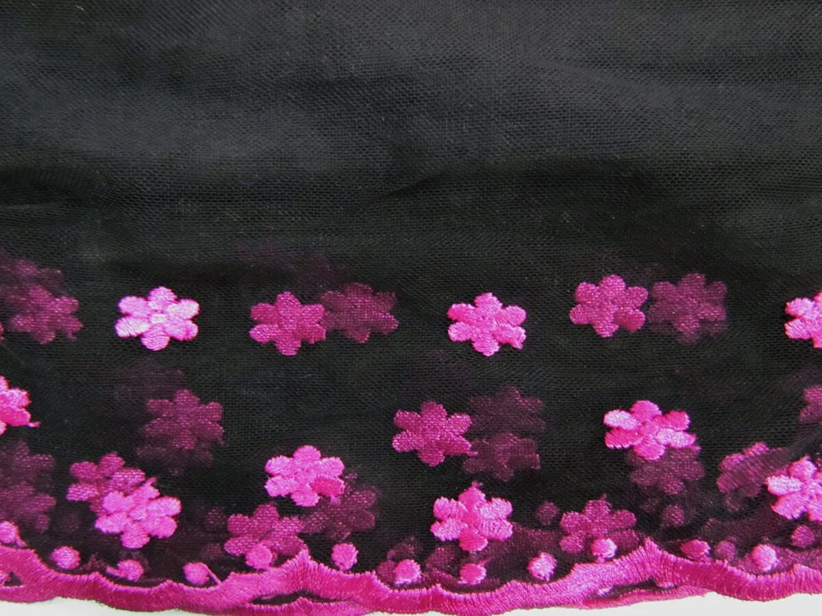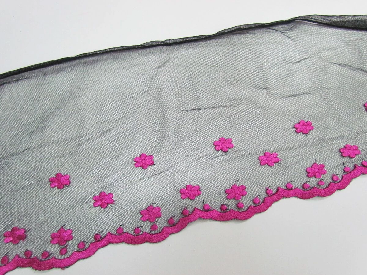 This trim features lovely magenta floral embroidery on a black nylon mesh. This trim is light weight with a soft and smooth feel, and is ideal for adding to various apparel and other projects.
