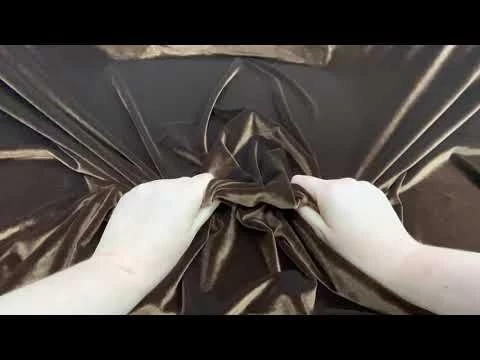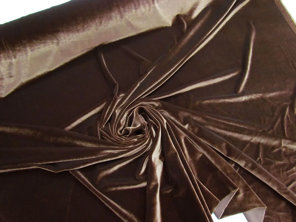 This lovely chocolate brown coloured stretch velvet fabric stretches very well along the weft of the fabric and moderately along the warp. Catches the light wonderfully, would be gorgeous as gowns, dresses, as well as tops and with it being a 2 way stretch fabric could also be used for dance and theatrical costumes.
