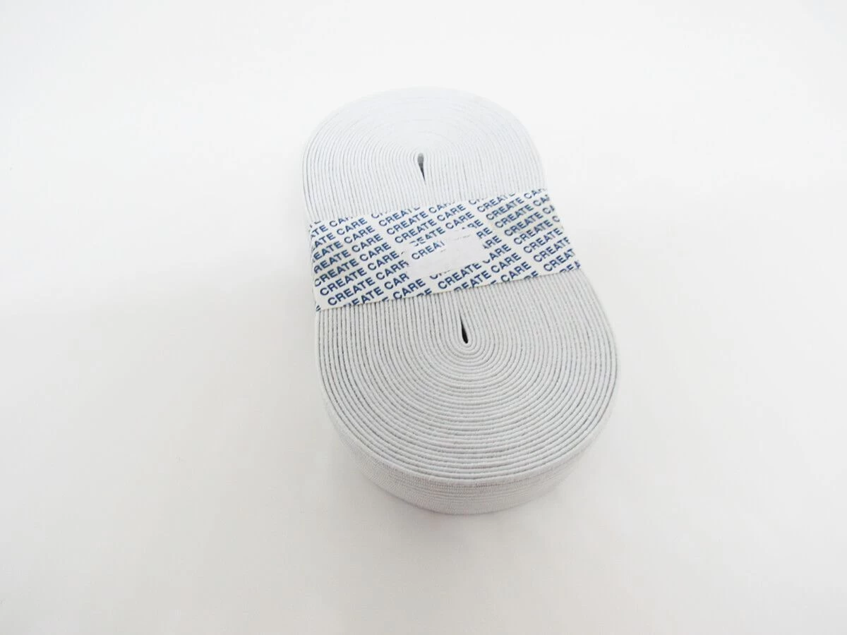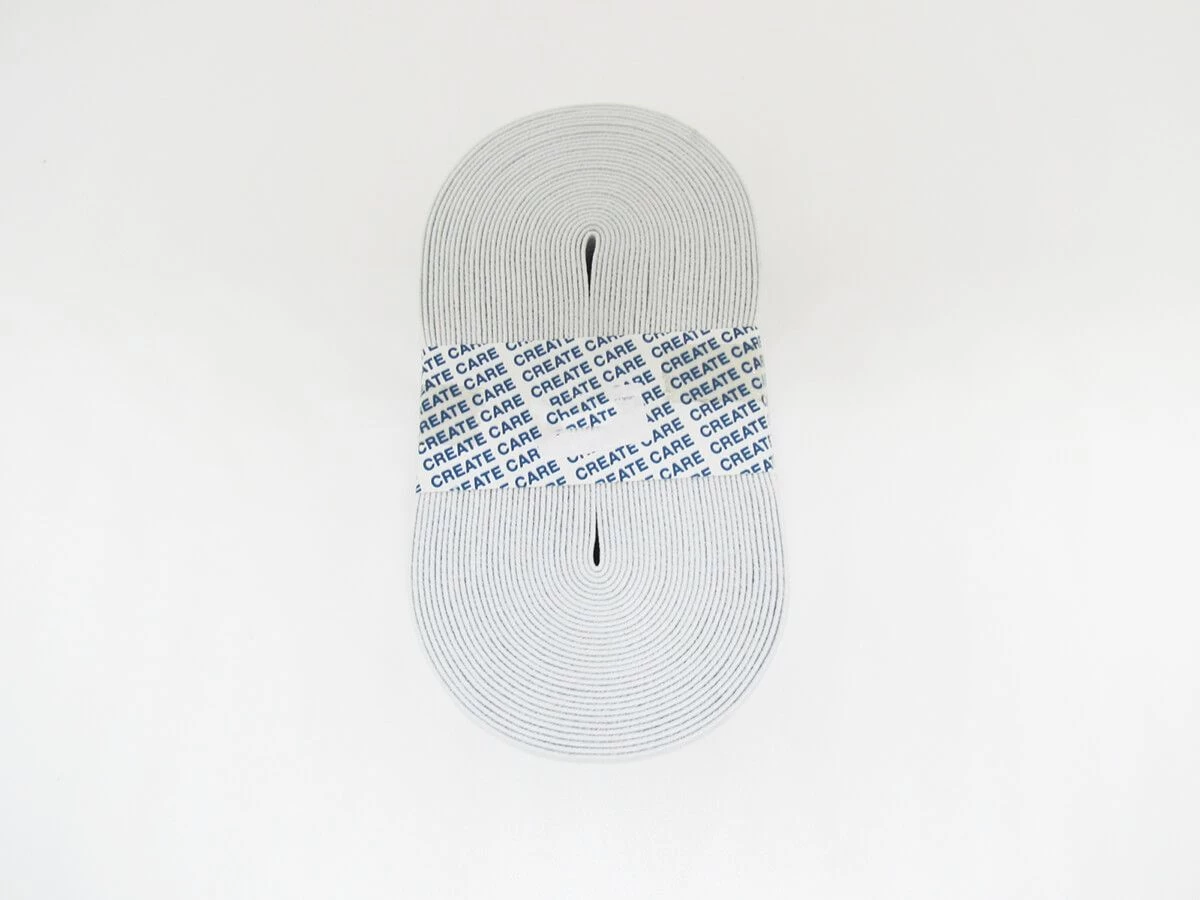 This braided elastic is approximately 2 cm wide. This braided elastic features ribs of thin rubber braided in a white toned polyester, and which has good stretch and return. Braided elastic is a popular general purpose elastic, with a soft and comfortable feel, that is also strong and durable. Braided elastic is a good choice for narrower widths of elastic. Colour is a grey toned white.