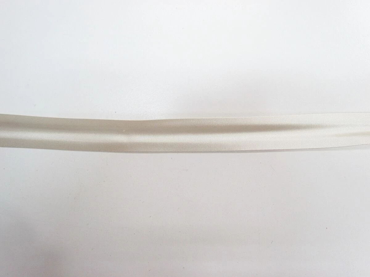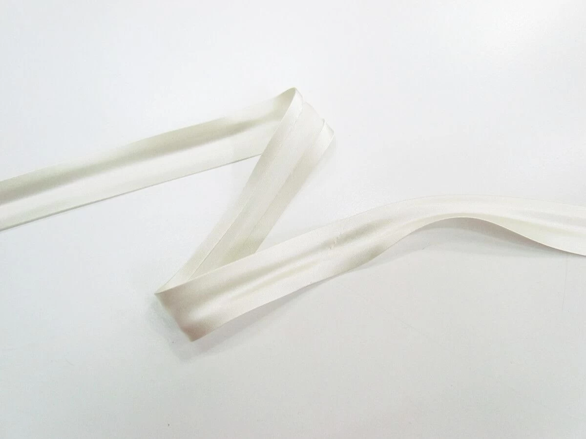 This plain cream coloured satin bias binding tape is a satin cut on the bias that has been folded with the raw edges in towards the centre and pressed to hold this fold, for ease of use in sewing projects. This folded binding tape cut on the bias has give and flexibility that means this binding tape will curve for a neatly finished edge on armholes and necklines, to bind seams, for making piping, or as a simple alternative for straps. This bias binding is approximately 20mm flat, with the folded edges.