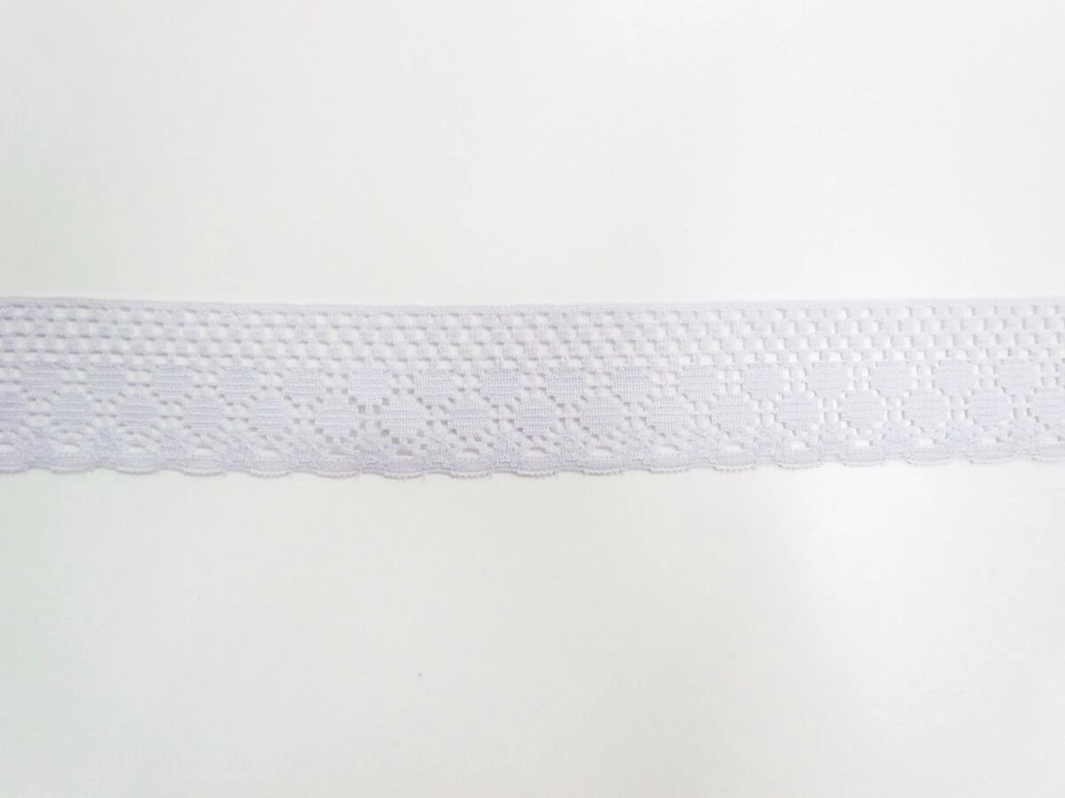 This stretch trim is approximately 2.5 cm wide and is a light and soft stretch trim option. This is a lace look trim, that stretches well along the length of the trim. This trim is light and flexible, and is suitable for decorative and dressmaking uses, in garments, crafts, and accessories.