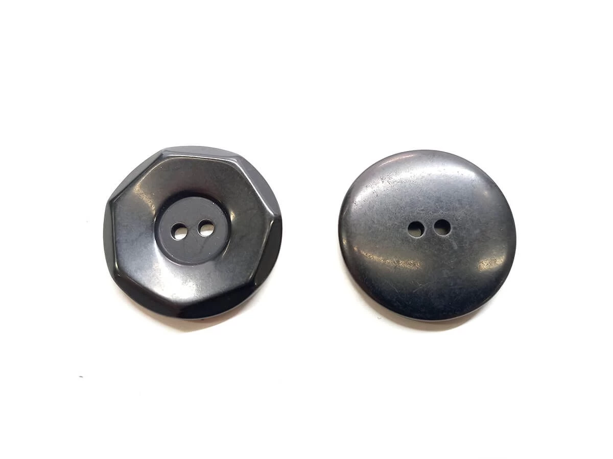 This button is approximately 27 mm in width. It is matt black plastic with a hexagon feature on the surface. his is a 2 hole type, sew on button. This button is suitable for use as a fastener, on new garments or as a replacement on old garments. This button is also suitable for craft uses, or for decorative uses.