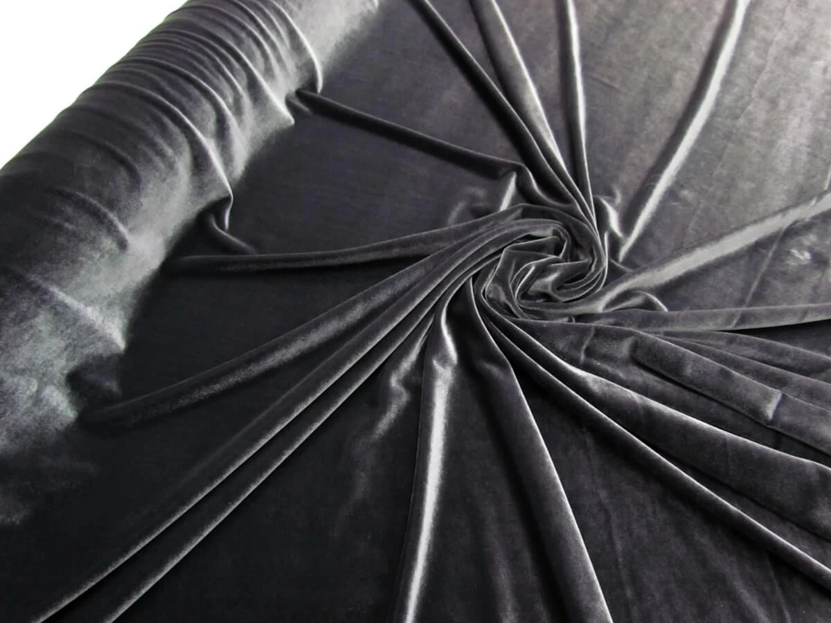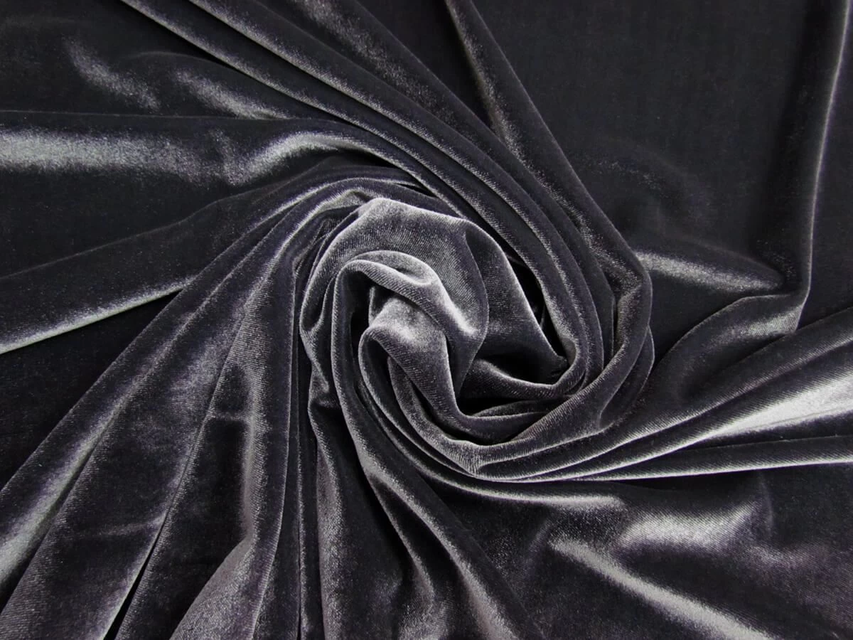 This lovely deep grey coloured stretch velvet fabric stretches very well along the weft of the fabric and moderately along the warp. Catches the light wonderfully, would be gorgeous as gowns, dresses, as well as tops and with it being a 2 way stretch fabric could also be used for dance, theatrical, leotards etc. As a stock service fabric, this fabric can be reordered to fill large order and ongoing supply