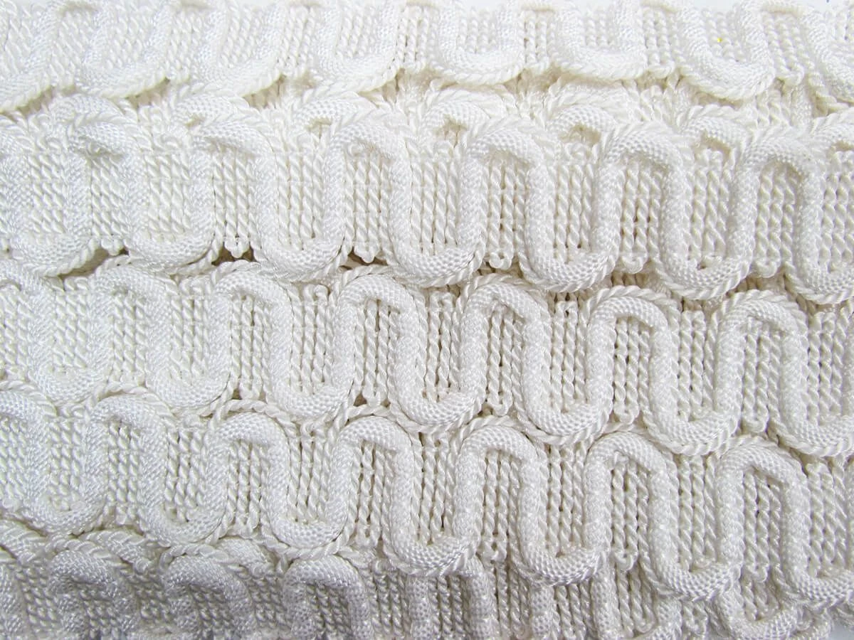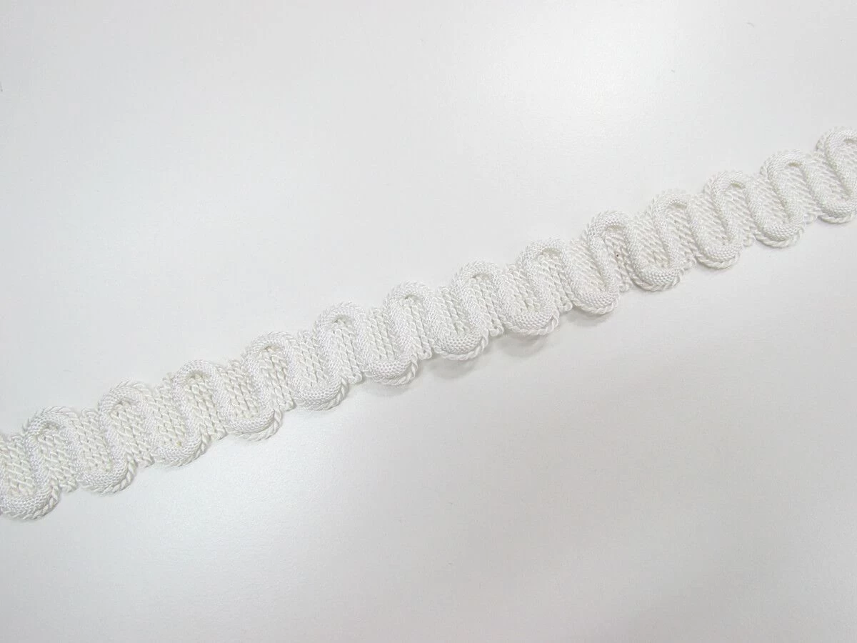 This braided cord made from a blend of rayon and polyester measures 30mm in width. This cord has a slight lustrous sheen and scallopped edges due to the weave of the cording.