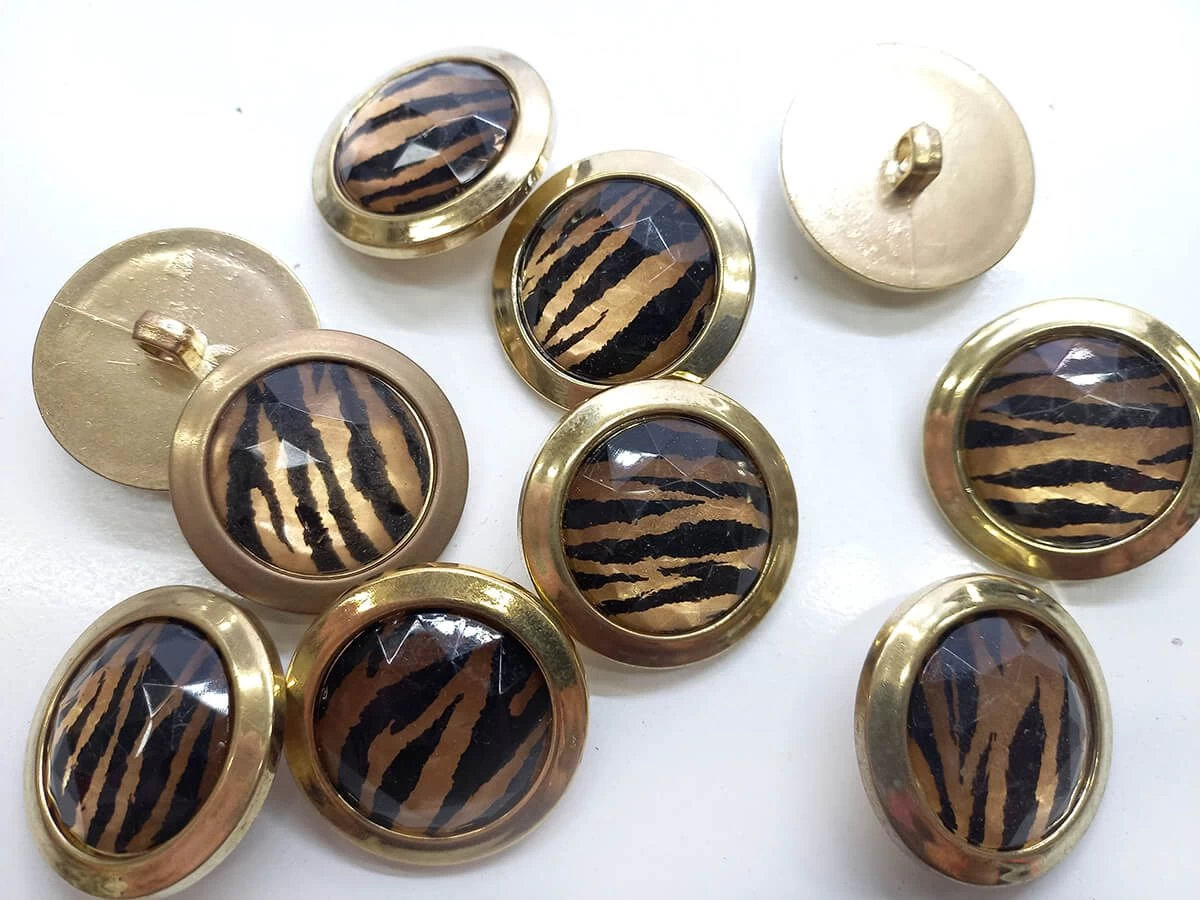 This button is approximately 32mm in width. It has a tiger print finish with a gold rim. This is a shank back type, sew on button. This button is suitable for use as a fastener, on new garments or as a replacement on old garments. This button is also suitable for craft uses, or for decorative uses.