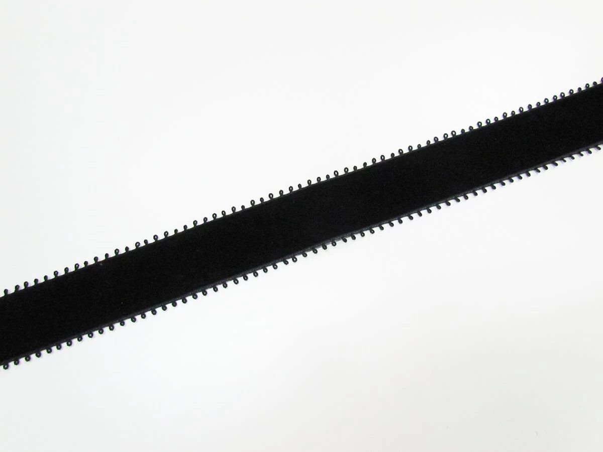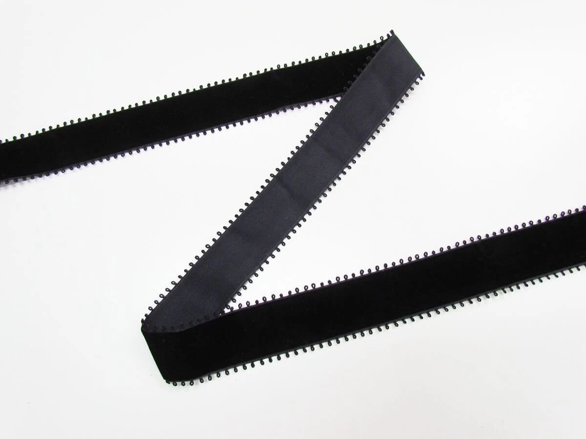 This black velvet ribbon measures approximately 30mm in width and has small loops bordering the ribbon on either side, bringing the total width to 38mm. This soft velvet ribbon is ideal for adding to apparel, costuming and craft projects.