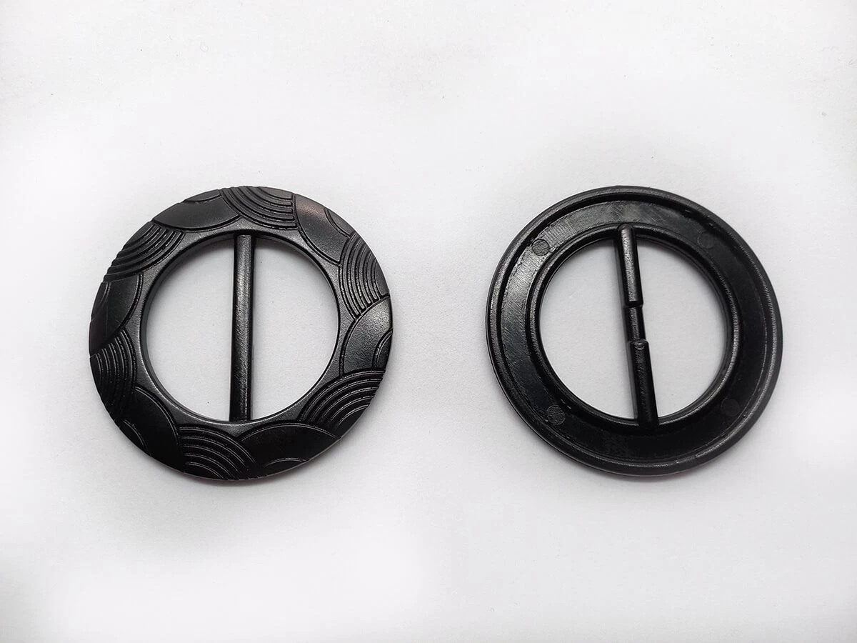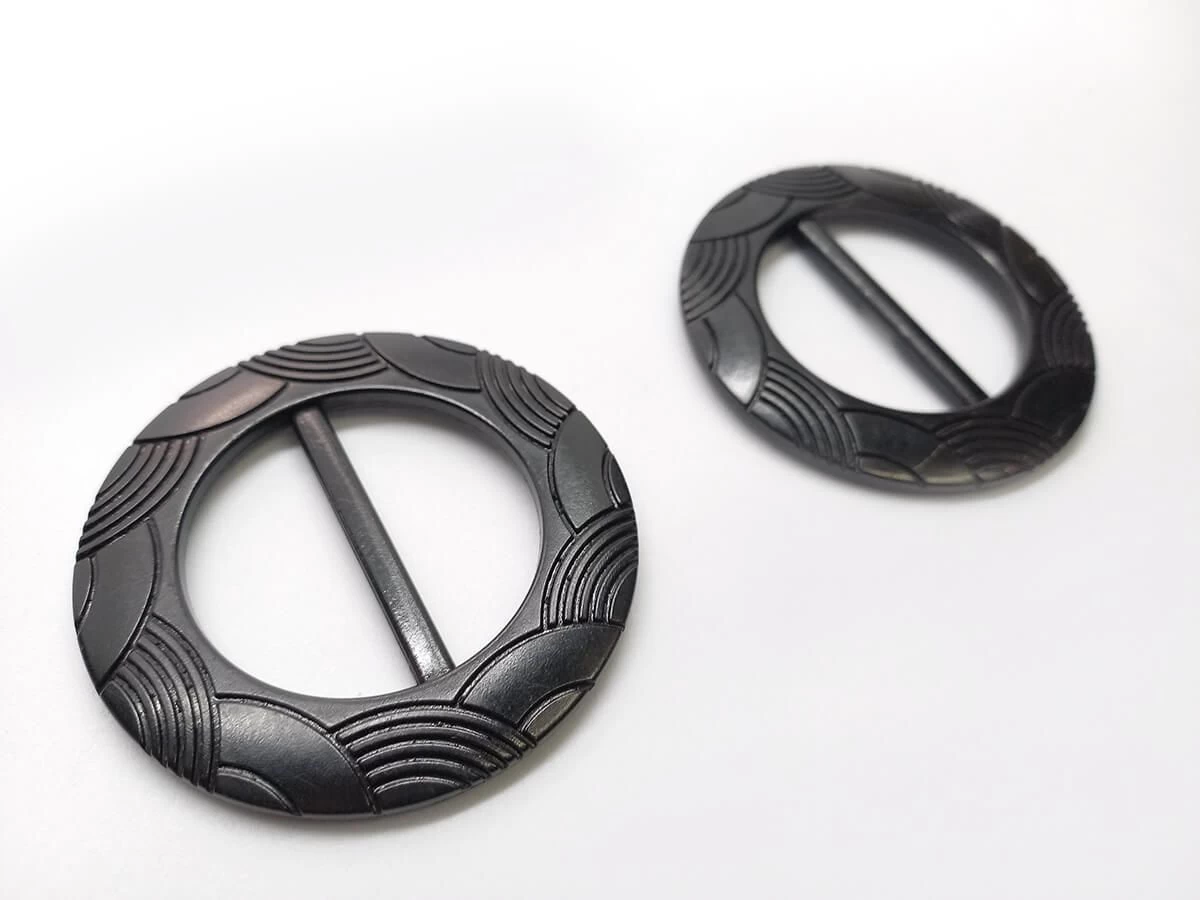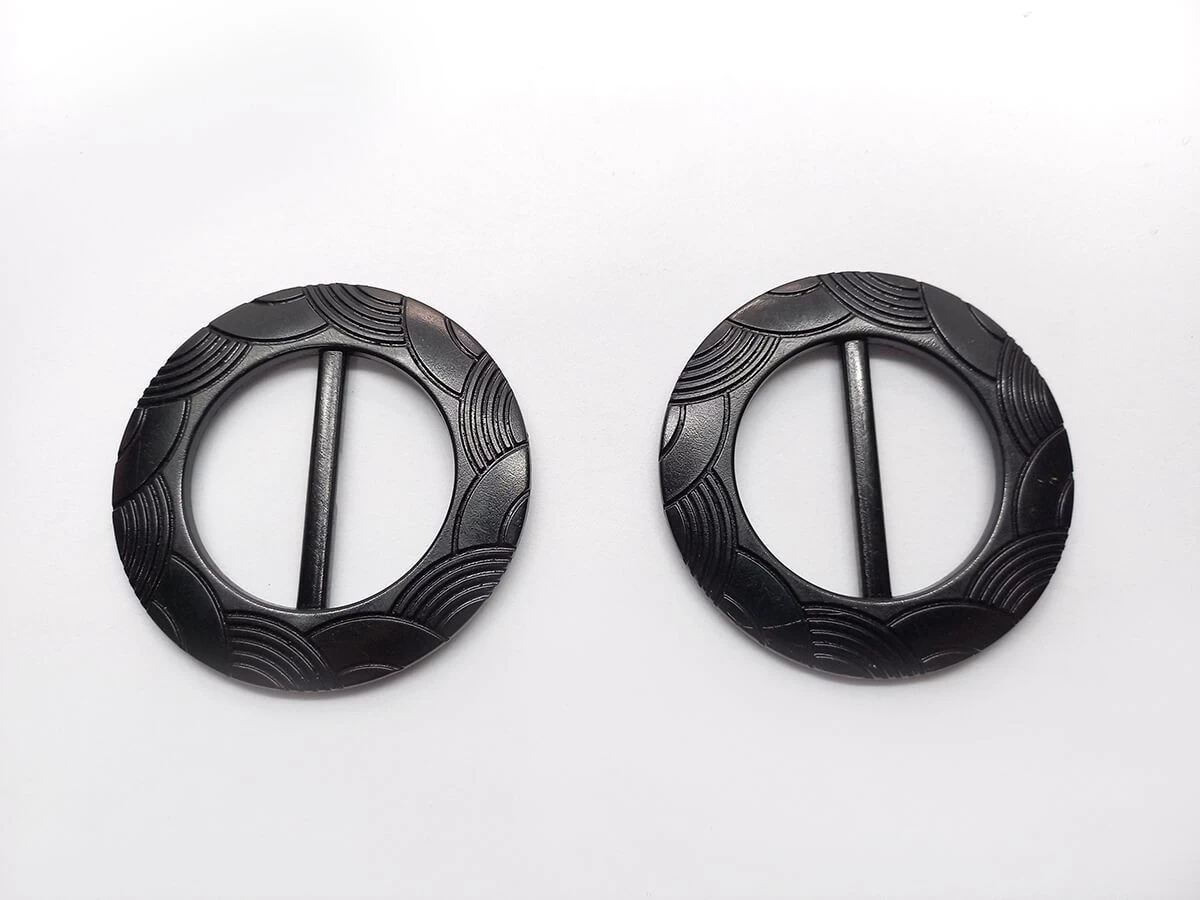 This buckle like accessory is approximately 65mm diameter. This buckle is lightweight, and a black colour with etching. This is a slider type buckle, through which belts, ties, or straps are threaded trough. This buckle will fit a maximum 40mm fabric width.