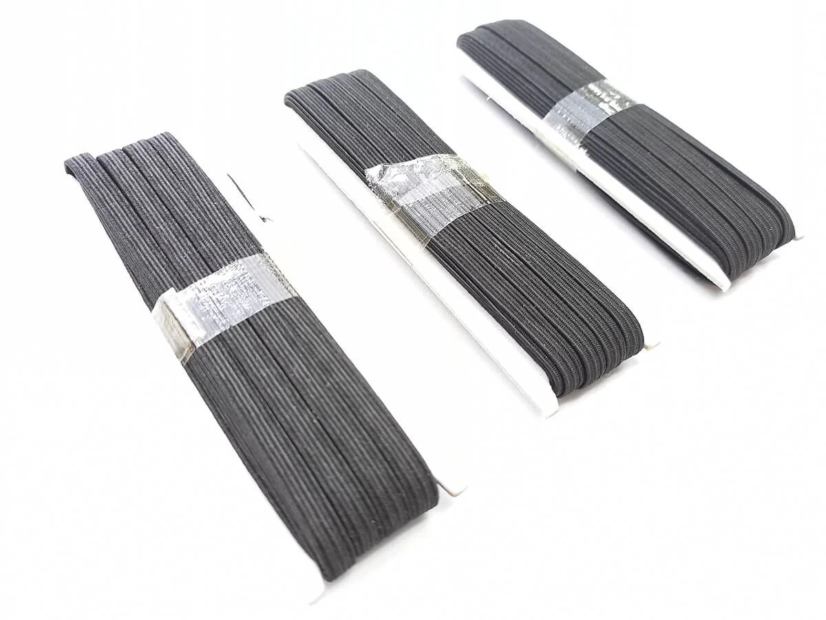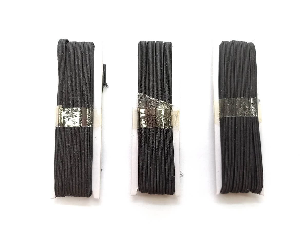 This elastic bundle pack include 3 rolls o 5 meter each. It is a total of 15m of 5mm braided elastic. This is a thin, soft elastic suitable for the edges of garments, inside of scrunchies and other projects.