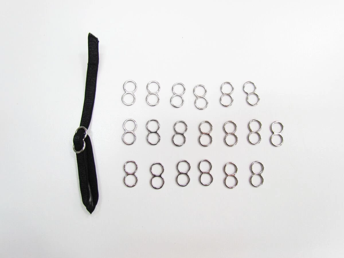 This is a pack of 20, strap adjusters. These are a slider type (8 shaped) strap adjuster. These adjusters are very light and comfortable. These adjusters are a silver in colour. These adjusters are often used to finish lingerie and swimwear straps. The size of strap these adjusters will fit, is up to 6mm. The total size of the accessory is a little bigger at 9mm wide x 16mm long.