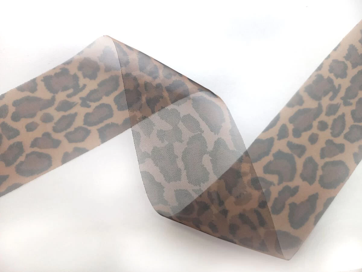 This ribbon is made from sheer organza and features a cheetah animal print. It is approximately 75mm. It is somewhat stiff and holds it shape when formed into bows.