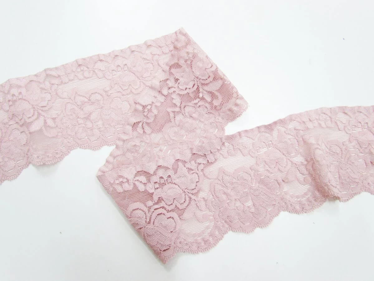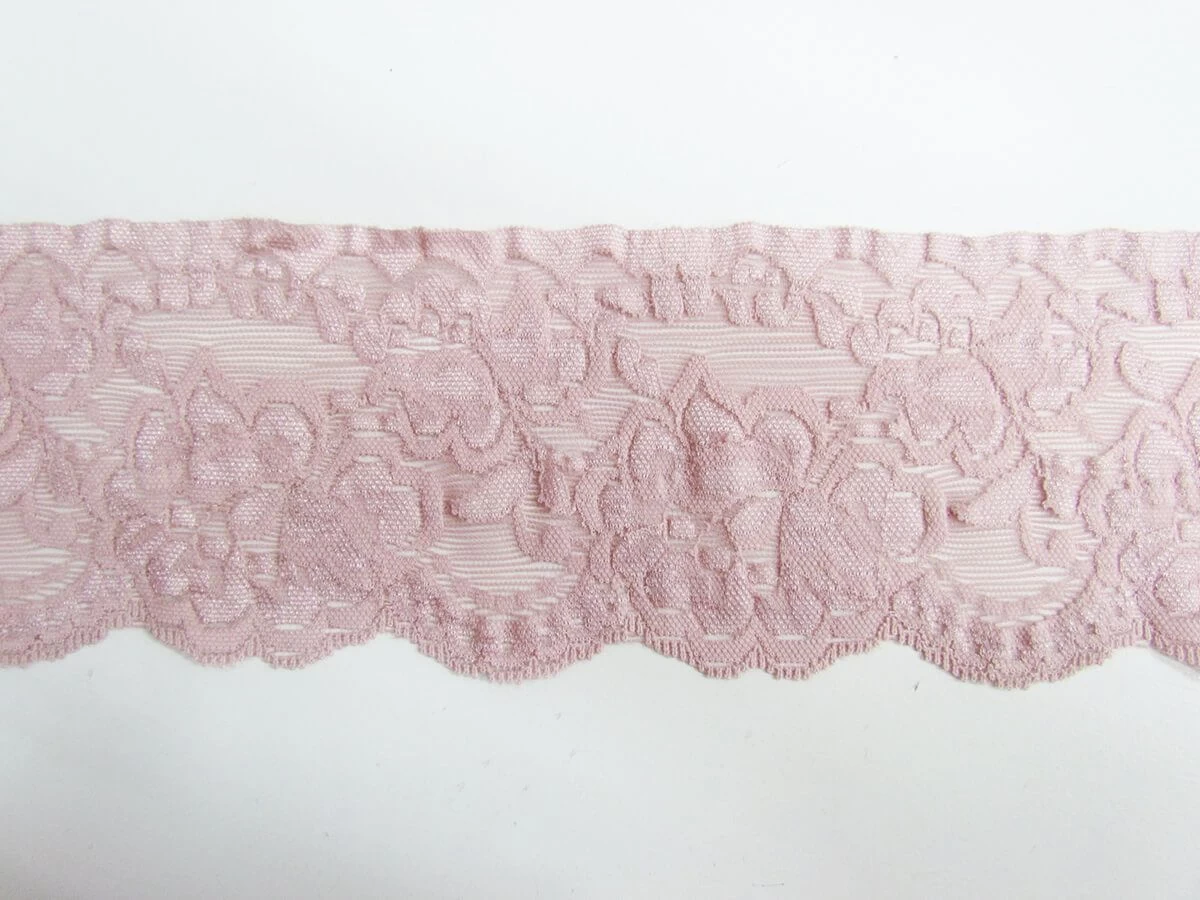 This stretch trim is approximately 8.5 cm wide and is a light and soft stretch trim option. This is a lace look trim, that stretches well along the length of the trim. This trim is light and flexible, and is suitable for decorative and dressmaking uses, in garments, crafts, and accessories.