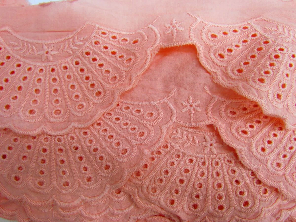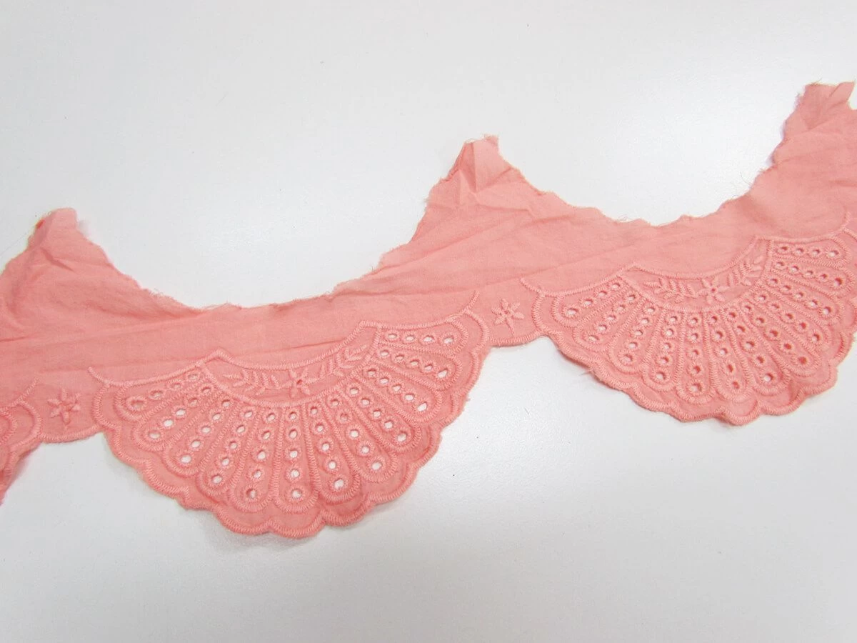 This broderie trim features a lovely embroidered design on a lightweight cotton. This trim has a a decorative scalloped edge, with the opposite edge running in a parallel scallop. The width of this trim at any given point of the scallop is approximatly 85mm, however the total width from the point of the decorative edge to the point of the opposite edge is approximately 150mm. This trim is ideal for adding onto any apparel or costume appliations.