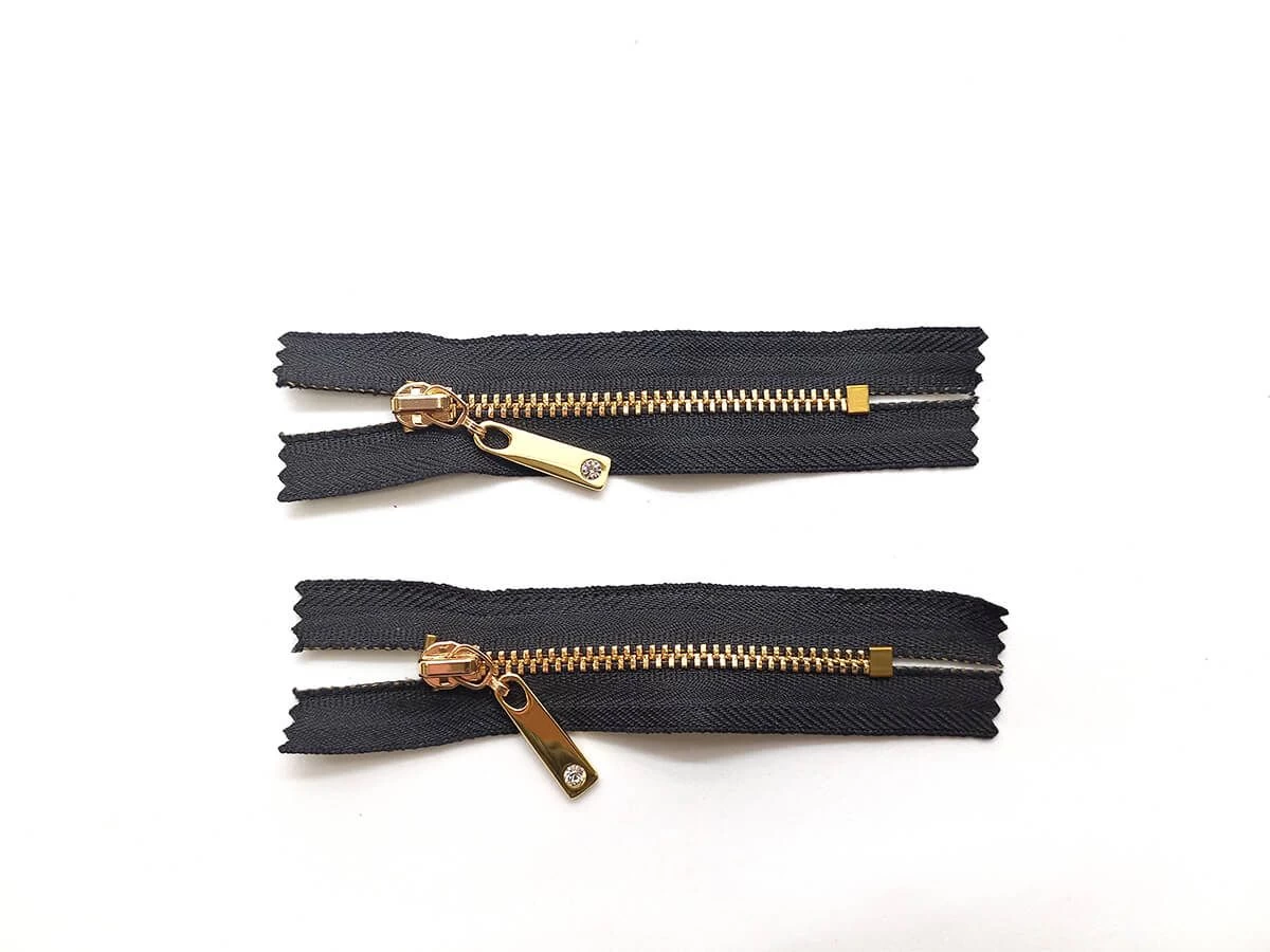 This zipper bundle pack contains 2 closed end zips, with gold metal teeth and zipper pulls. The zip pulls also have diamantes embedded. The zip tape is black colour. The length of the closed zip, from the bottom of the teeth to the top of the zipper pull is approximately 9cm.