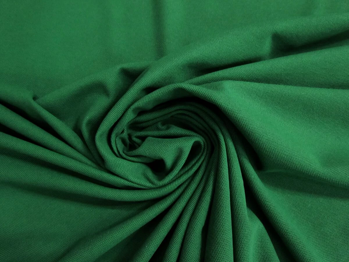This green toned pique knit is a textured knitted feel fabric. This is a light to mid-weight knit, with a little give along the weft, but no real stretch. Pique is traditionally a sportswear knit, suitable for polo shirts, or tennis and golf style outfits. This pique knit is semi-opaque, and does show through a little and more in some lighting. This cotton and polyester blend knit will be comfortable and breathable.