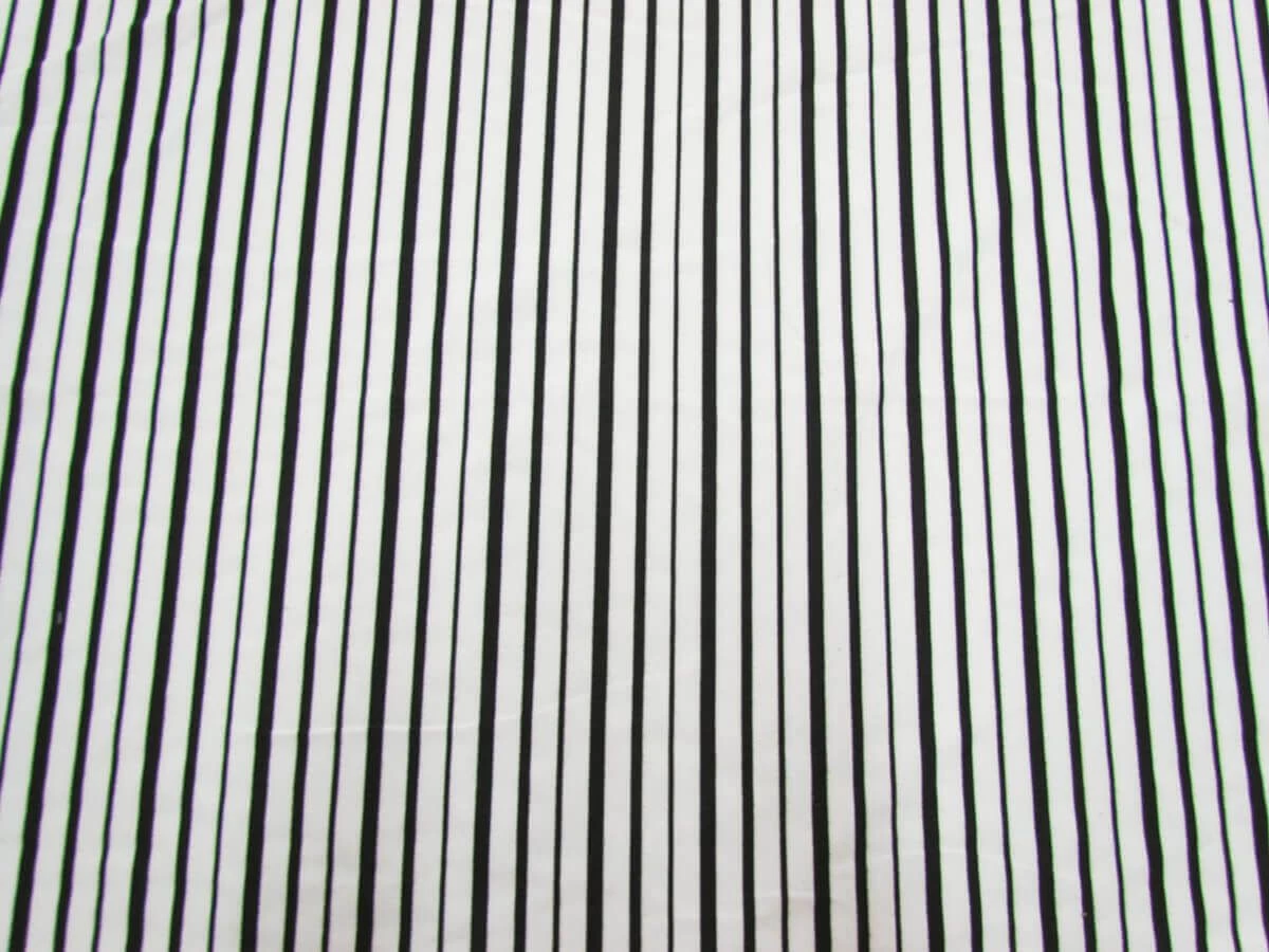 This ponte double knit fabric has a thick knit feel. This is a lovely feel knit, and a comfortable heavier weight fabric. This double knit fabric has some stretch and return along the weft of the fabric, and no stretch along the warp. This fabric has vertical stripes of varying sizes running along the 160cm width of the fabric. This ponte knit fabric is nearly-opaque, but shows through in the lighter parts, and when stretched.