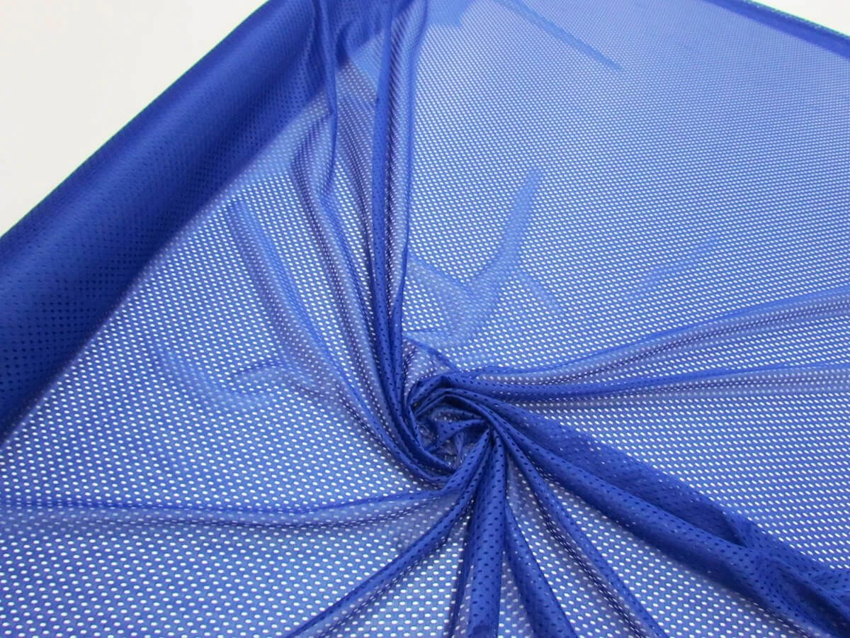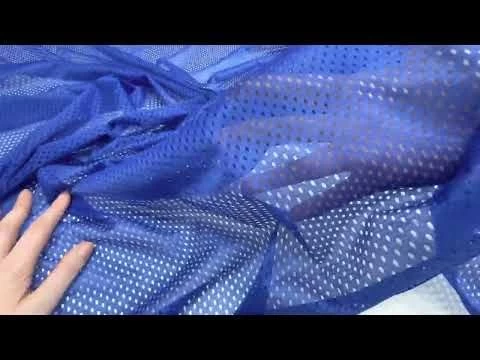 This lightweight polyester mesh fabric looks and feels like a traditional basketball mesh jersey fabric. This is a sheer and light fabric, with relatively large holes. There is a slight amount of give along the weft of the fabric. This mesh fabric has a smooth feel. This basketball mesh has a slight sheen finish. This fabric can be pared with a sports jersey fabric, if an opaque look is desired.