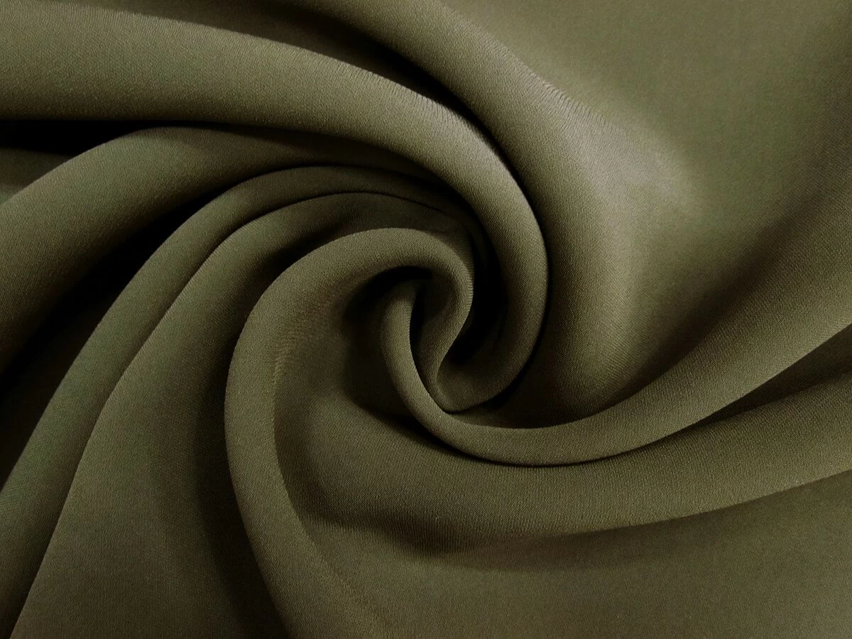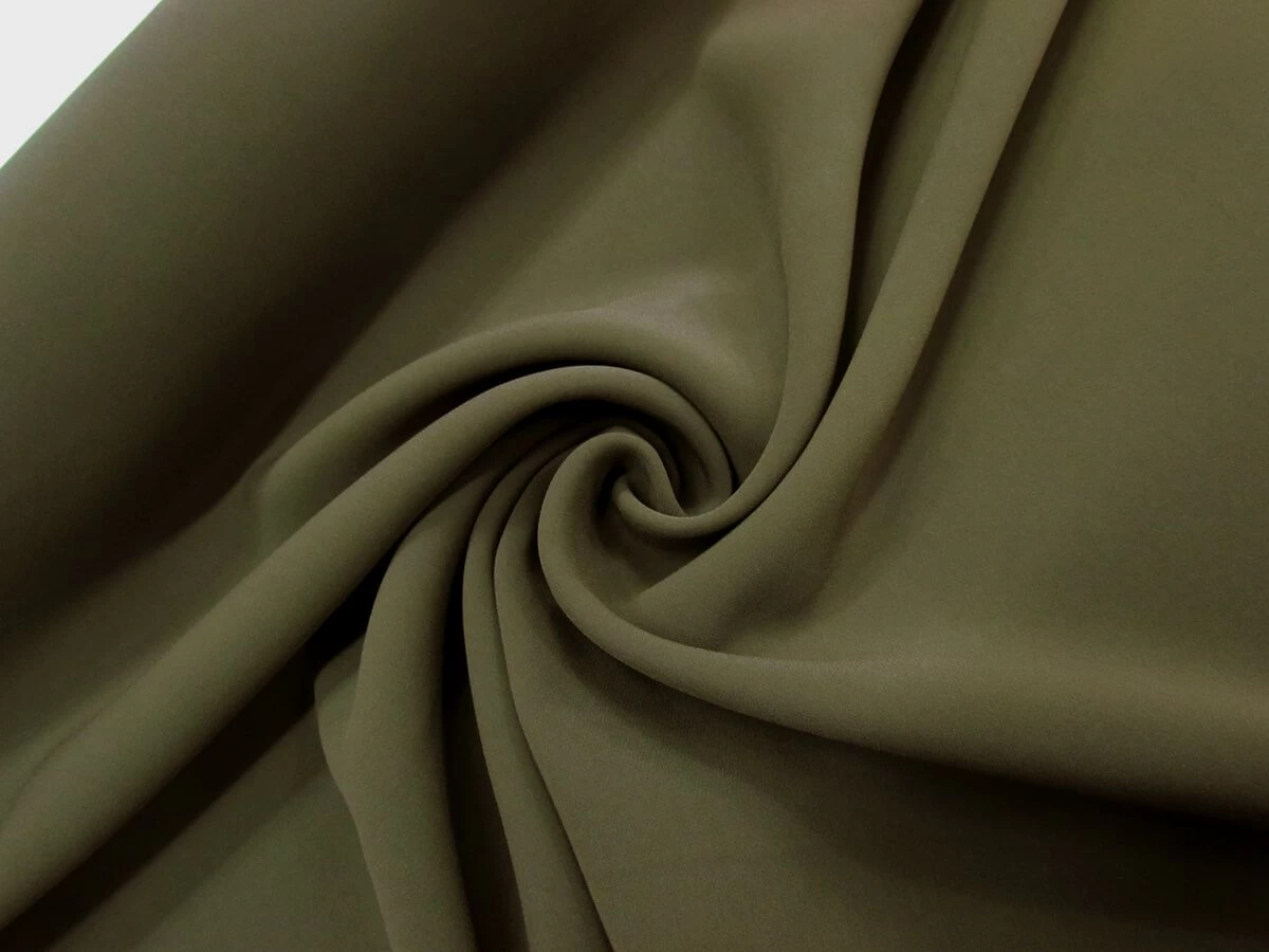 This bonded crepe is a heavy weight fabric with a light amount of structure and slight two way stretch and return. This fabric is made up of two pieces of crepe that are bonded together to create a double faced fabric that is more thick and structured. This bonded crepe has a subtle texture created by the crepe weave and is an opaque fabric, remaining opaque when stretched.