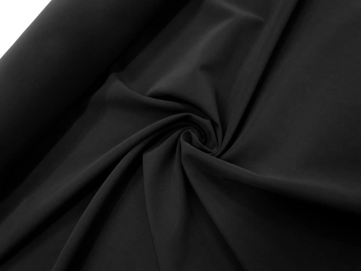 This black bonded spandex is a heavy weight fabric made up of two layers of spandex that have been bonded together to create a stronger and more structured fabric compared to a regular spandex. This spandex is made from a blend of 75% microfibre nylon and 25% spandex and has good two way stretch and return, with slightly more stretch along the weft and a strong hold. This bonded spandex is opaque, remaining opaque when stretched and is a breathable fabric that is quick drying, wrinkle resistant, easy to care for and also provides UV/sun protection. This spandex is great for swimwear and activewear where more structure and stability is desired, as well as various apparel and costume applications.