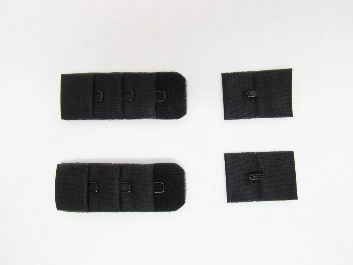 This adjustable bra back come with four pieces to make two bra backs. The hook side of the bra closure has one hooks and the other side has three rows of one bars to be easily adjustable. These pieces measure approximately 20mm in width and are suitable to be attached to bra backs of that width.