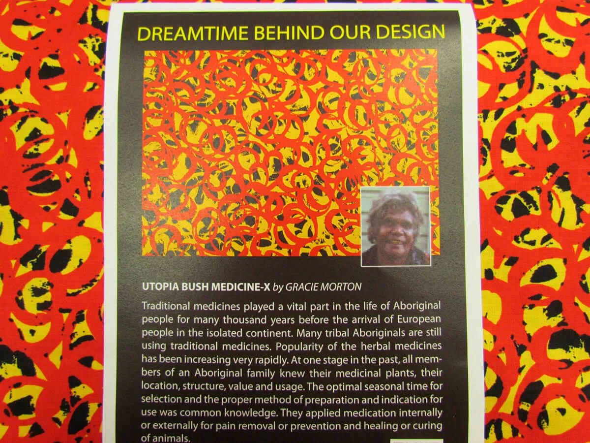 This indigenous artwork cotton features a bush medicine dreamtime inspired print. This fabric is 100% cotton fabric and a medium weight, with no stretch. This dreamtime story cotton fabric is perfect for clothing, as well as patchwork and quilting fabrics.