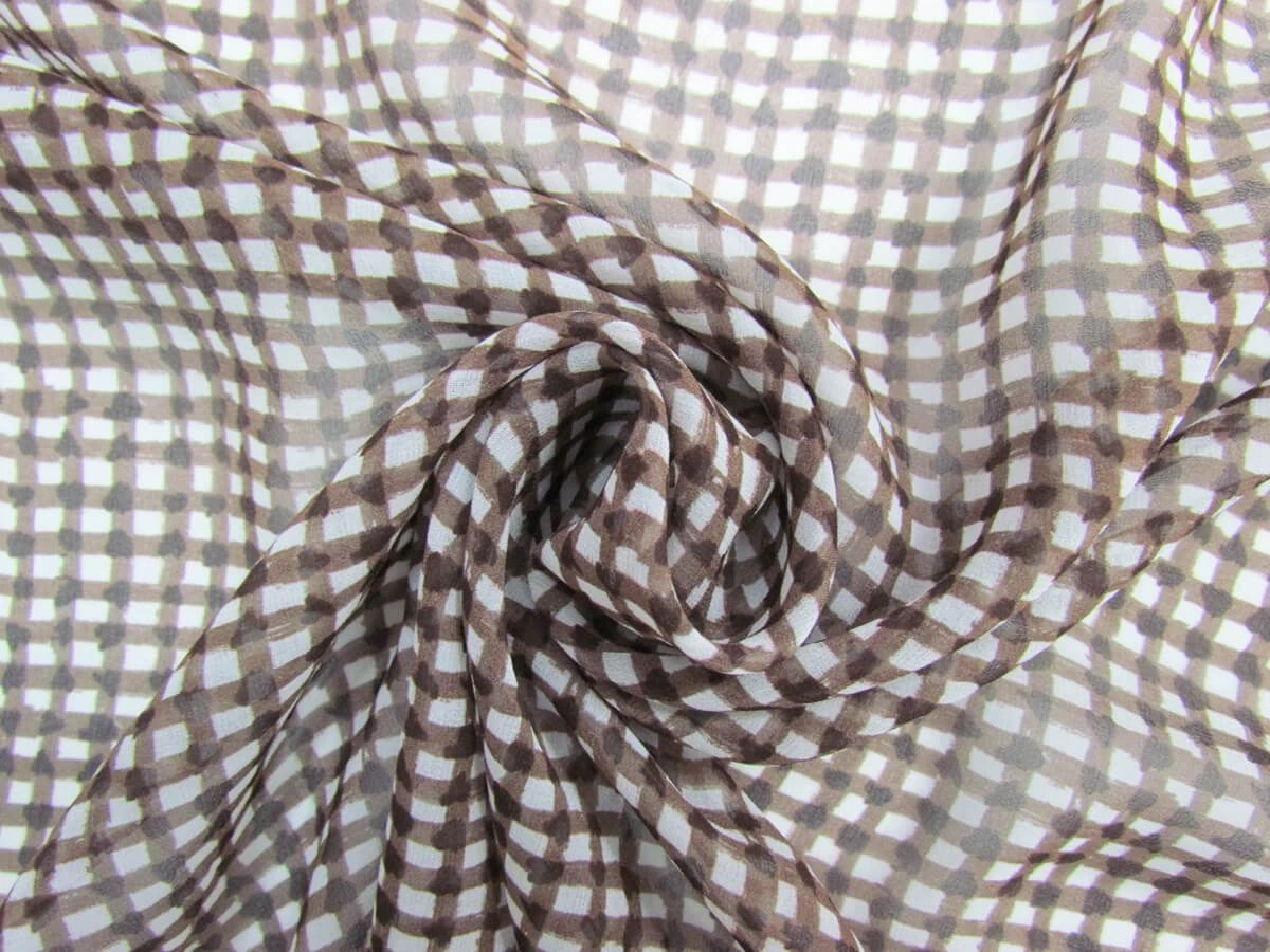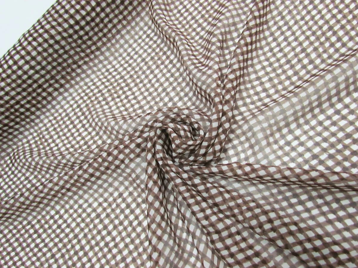This very light weight silk chiffon features a lovely hand drawn look brown check on a white background. This 100% silk has a very soft feel and is a sheer fabric. Due to the sheer nature of this fabric a lining may be desired for some applications.
