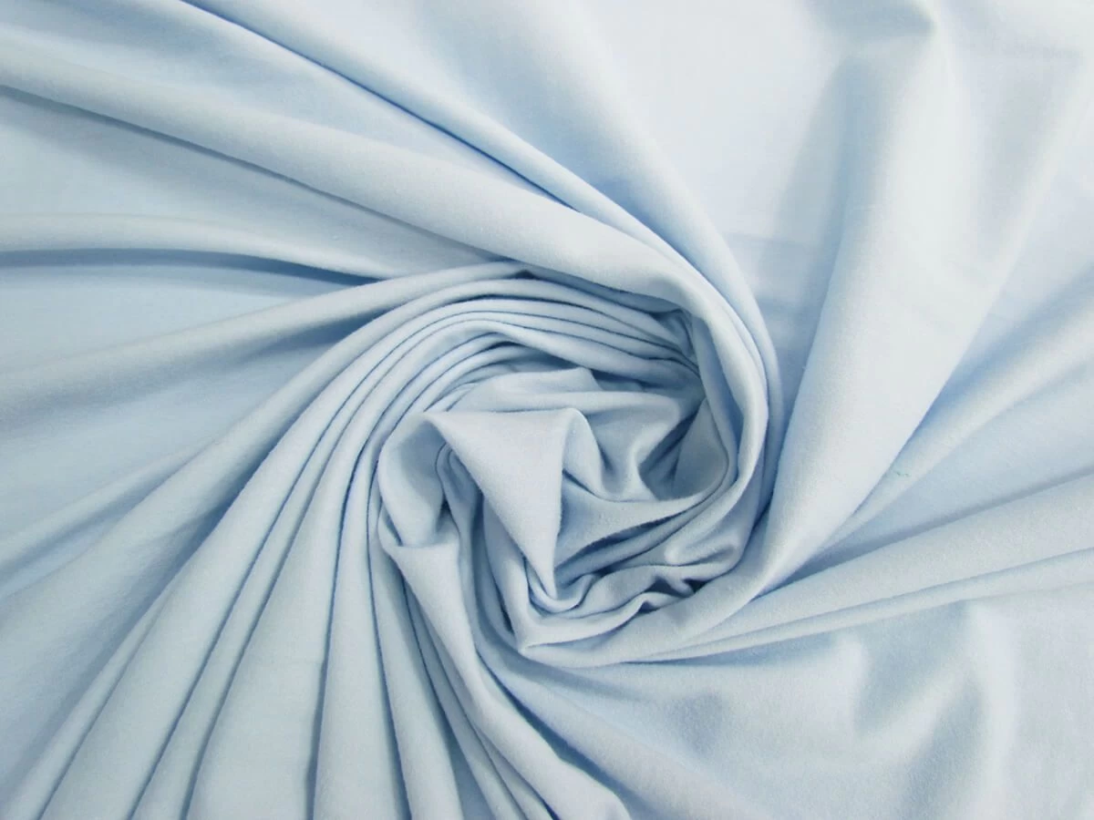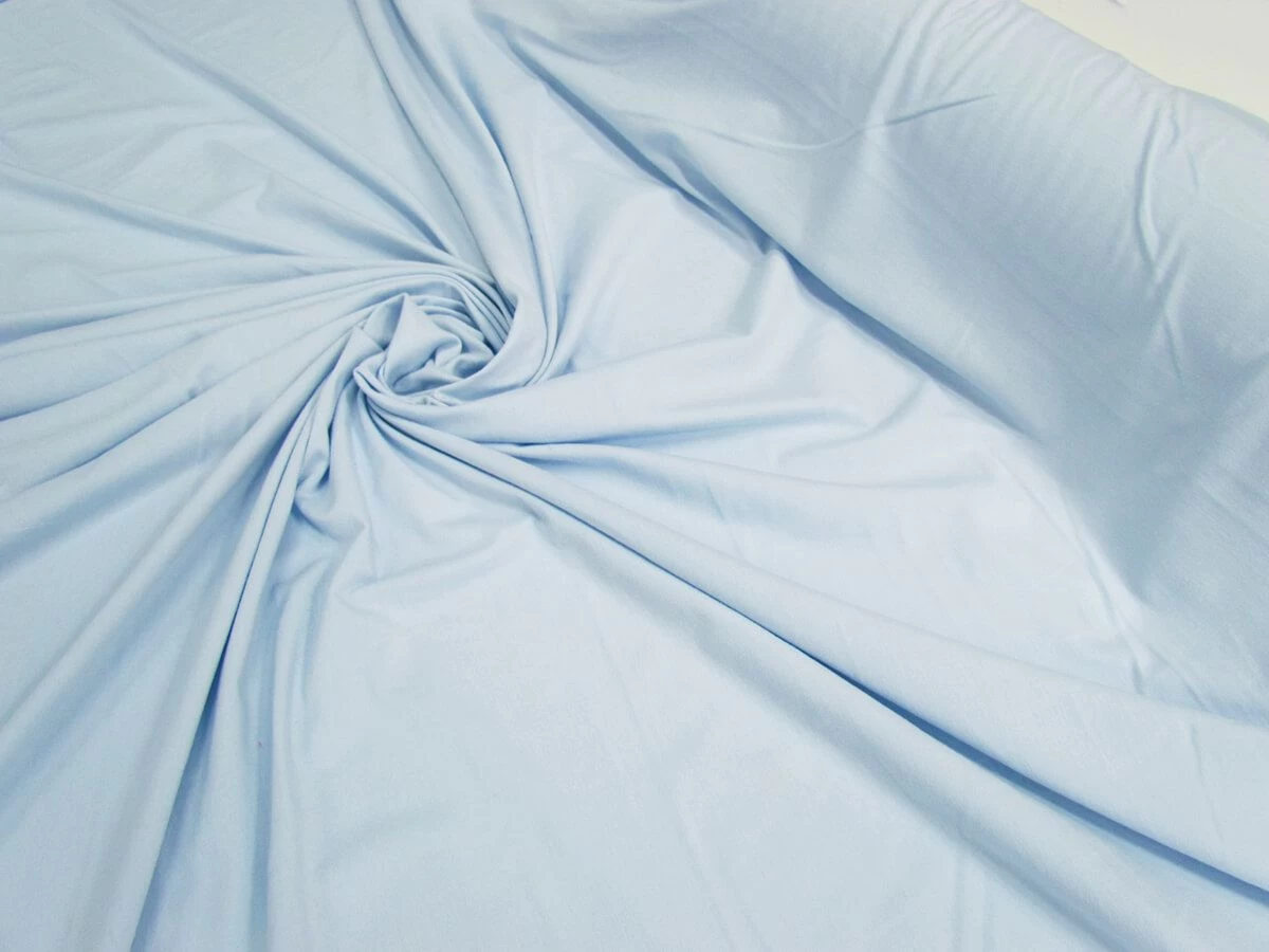 This cotton and polyester blend spandex fabric has a soft feel, and is a nice relatively mid-weight 2-way stretch cotton knit option. This cotton blend spandex will be comfortable and breathable, with a spandex stretch and support. This spandex has stretch and return in all directions. This is a plain blue toned cotton and polyester spandex, with a semi-opaque look, though it does sheer somewhat when stretched. This spandex is suitable for cotton active wear, dance wear, and cotton t-shirts. If using for active wear we suggest a double layer, using with a stretch lining fabric.