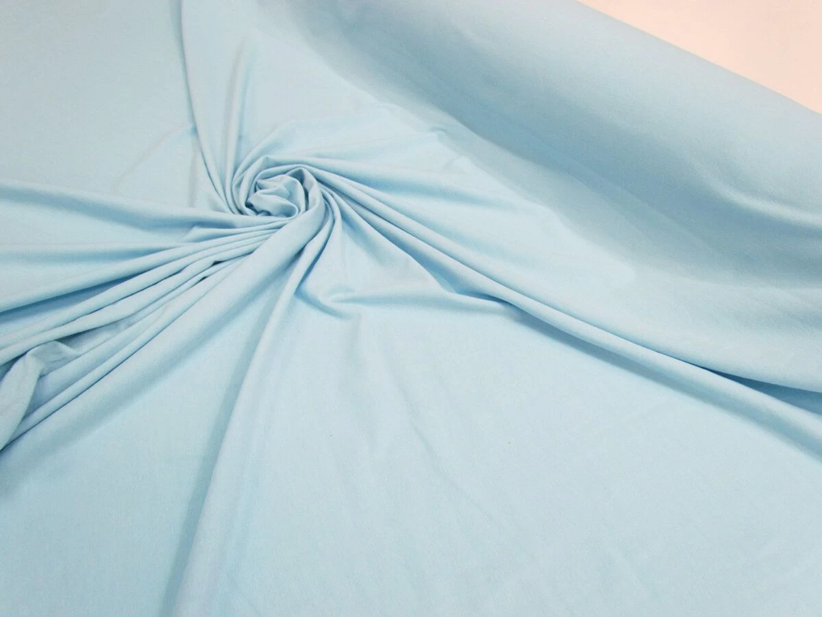 This cotton and polyester blend spandex fabric has a soft feel, and is a nice relatively mid-weight 2-way stretch cotton knit option. This cotton blend spandex will be comfortable and breathable, with a spandex stretch and support. This spandex has stretch and return in all directions. This is a plain blue toned cotton and polyester spandex, with a semi-opaque look, though it does sheer somewhat when stretched. This spandex is suitable for cotton active wear, dance wear, and cotton t-shirts. If using for active wear we suggest a double layer, using with a stretch lining fabric.