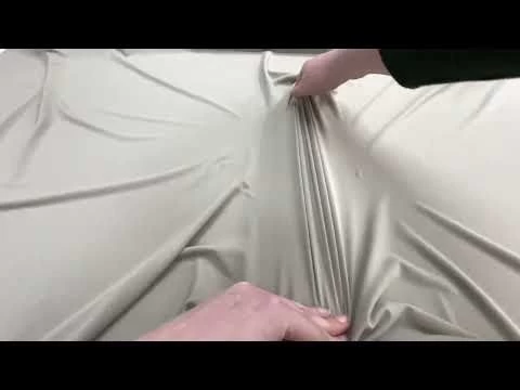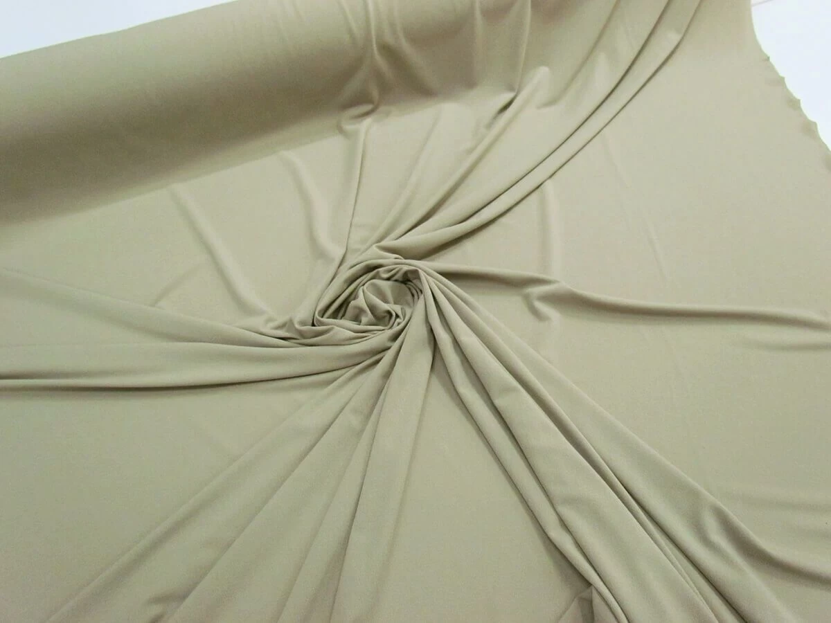 This jersey has a crepe like look and textured feel. This jersey fabric has great stretch and return in one direction, along the weft of the fabric, and some stretch along the warp of the fabric. This jersey fabric also has wonderful drape and fall. This fabric is only semi-opaque, and does sheer when stretched. This jersey is a green toned beige sort of colour.