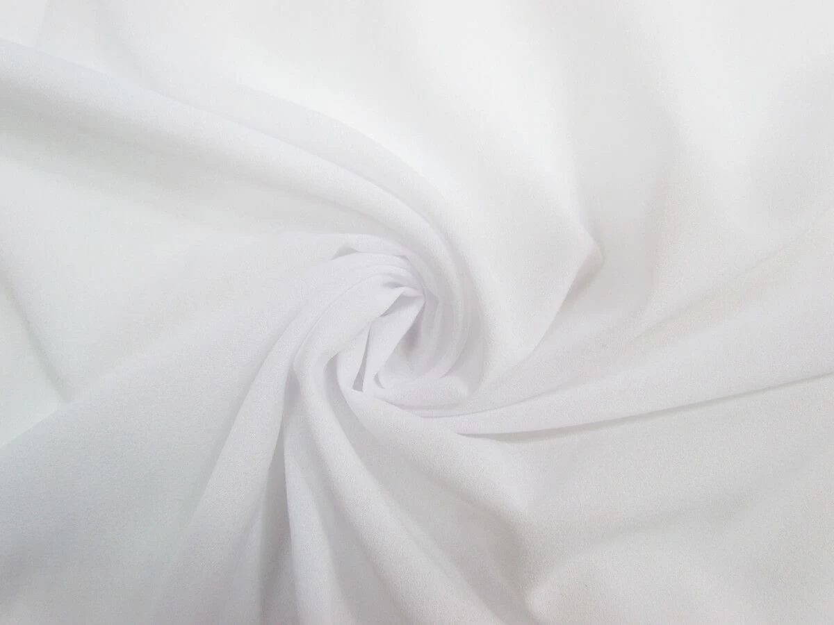 This crepe de chine in a cooler toned white is a light weight fabric with a lovely texture created by the weave of the fabric. This crepe has a slight stretch along the weft of the fabric. This crepe de chine is a mostly sheer fabric and a lining may be desired when creating apparel or costuming projects.