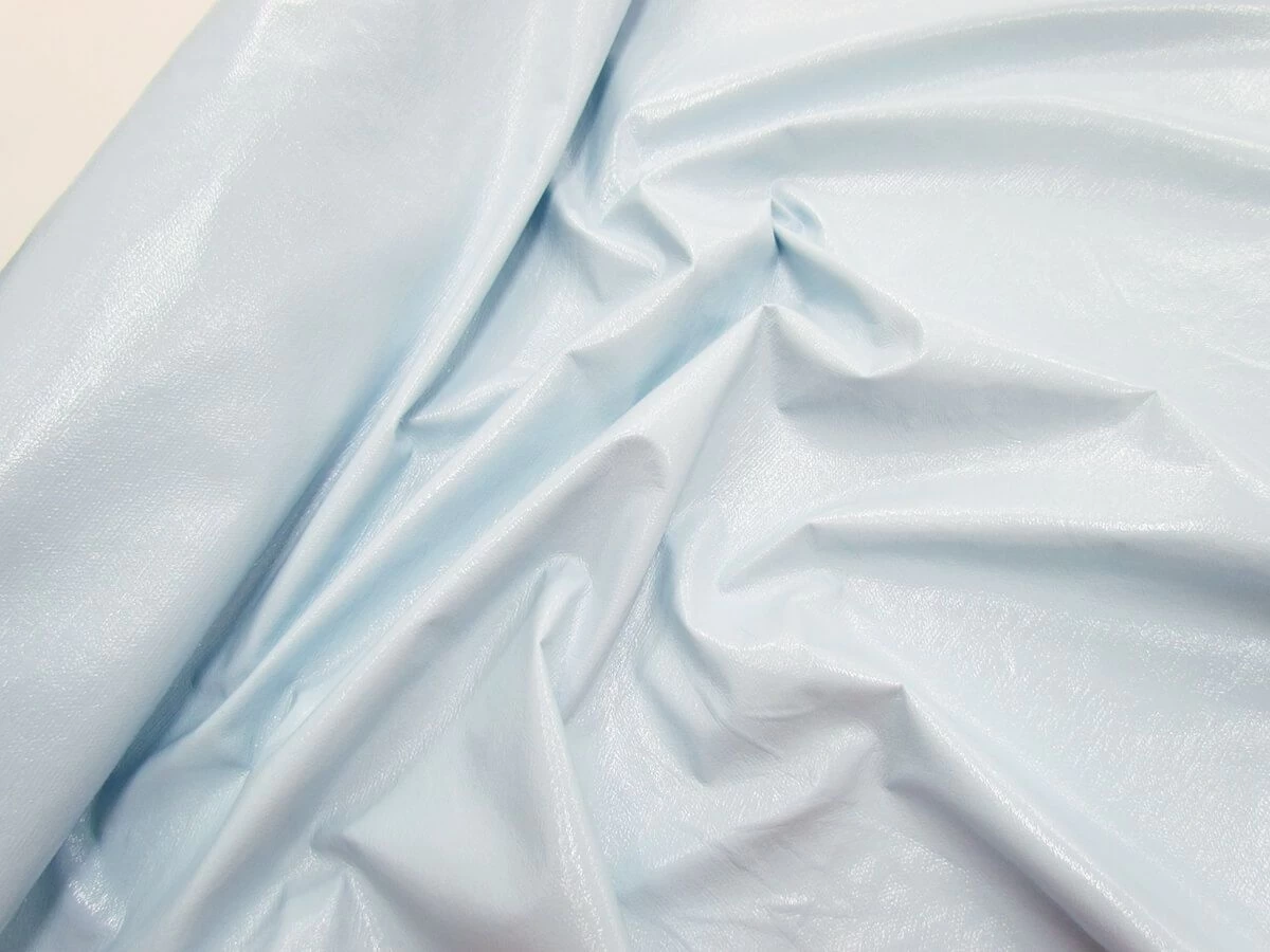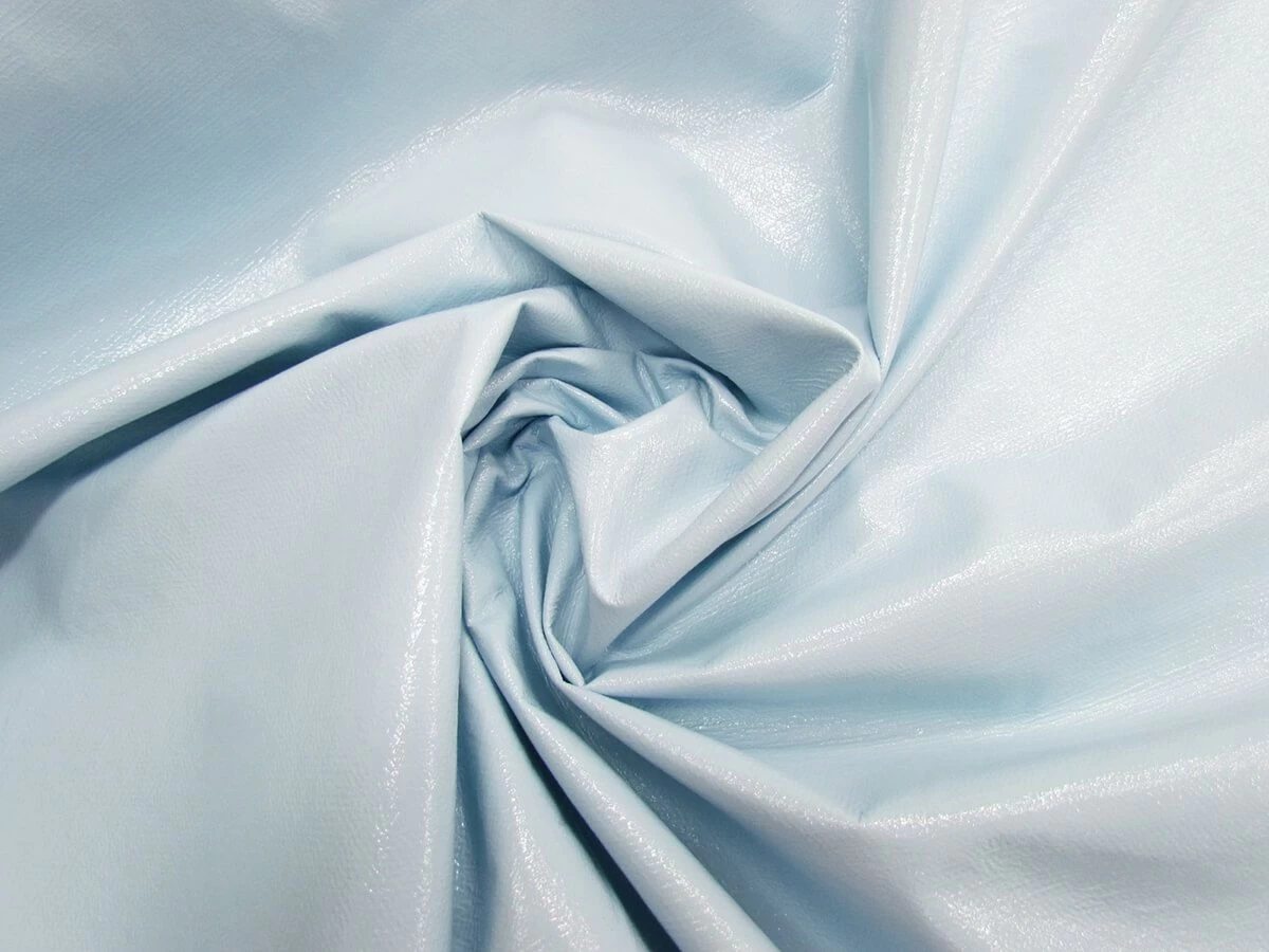 This is a patent vinyl fabric, with a crinkled texture look, in a pretty pale blue colour. This is a fabric with a glossy PVC face, coated over a soft woven cotton fabric backing, giving the crinkle look to the shiny patent face, and for comfortable feel to this vinyl. There is no stretch in this fabric. This is a light to mid-weight fabric that has an opaque look.