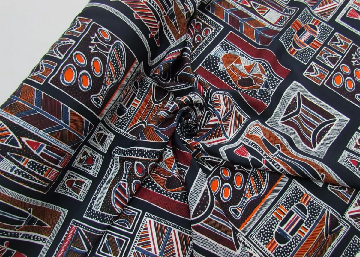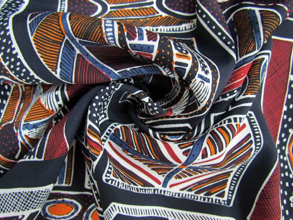 This polyester crepe de chine features a beautiful print of indigenous artwork. This crepe de chine is lightweight and is mostly opaque, although some more contrasting colours may be seen through, so a lining may be desired. The total width of this fabric is approximately 140cmm, however has a 22cm selvedge on one side making the print portion approximately 118cmm wide.