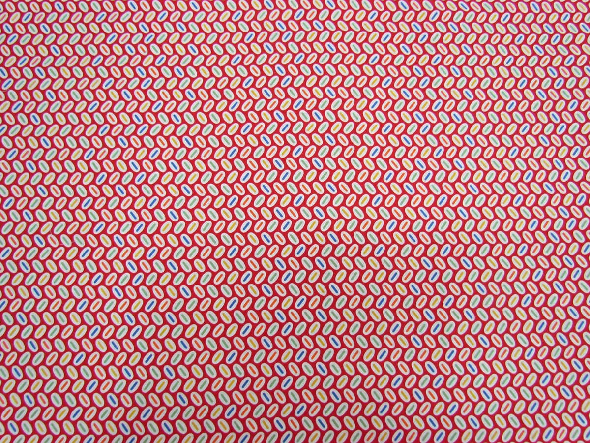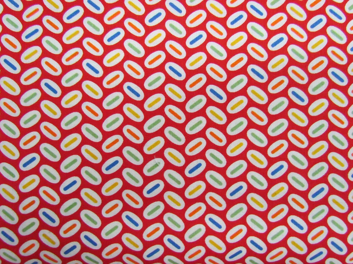 This 100% cotton fabric features multi colored oval print on a red background. This print is part of the Moda Fabric range Ducks in a Row, designed by American Jane Patterns. This cotton fabric is suitable for patchwork and quilting projects as well as shirts, tops, dresses and skirts.