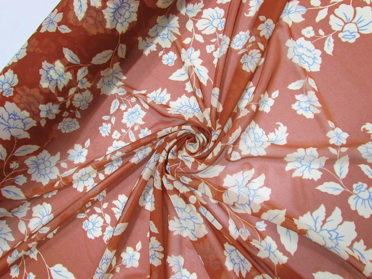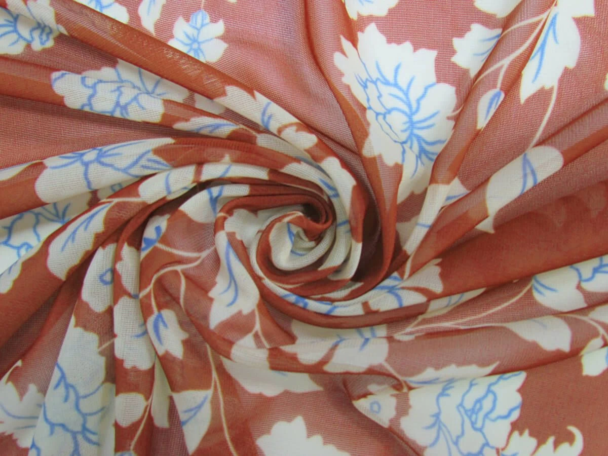 This rust red mesh with a cream floral print has great stretch and return along the weft of the fabric, with slight stretch along the warp too. This stretch mesh is a light weight fabric with nice drape that is sheer. This mesh has a wider selvedge and the width of the printed section is approximately 141cm with the total width being about 145cm.