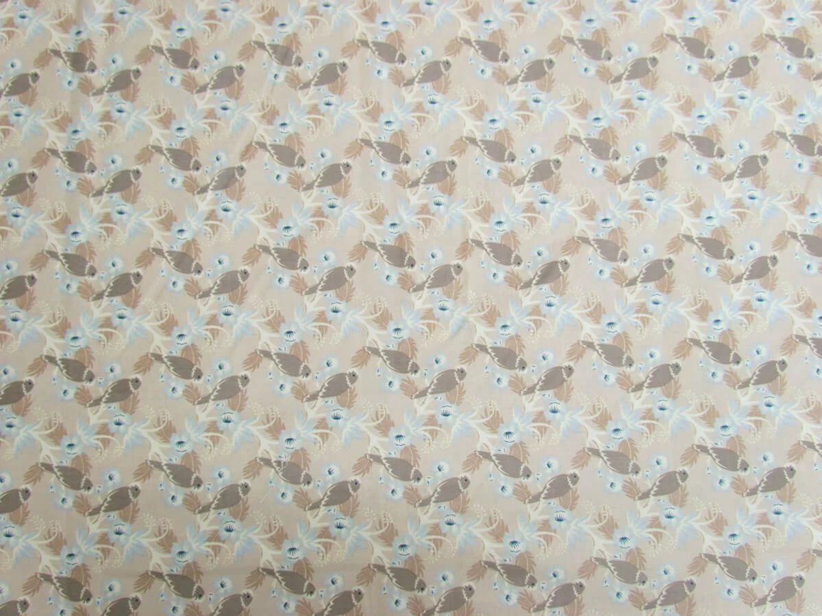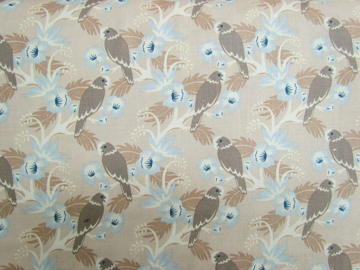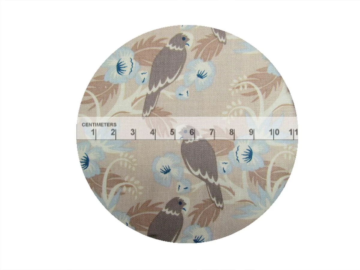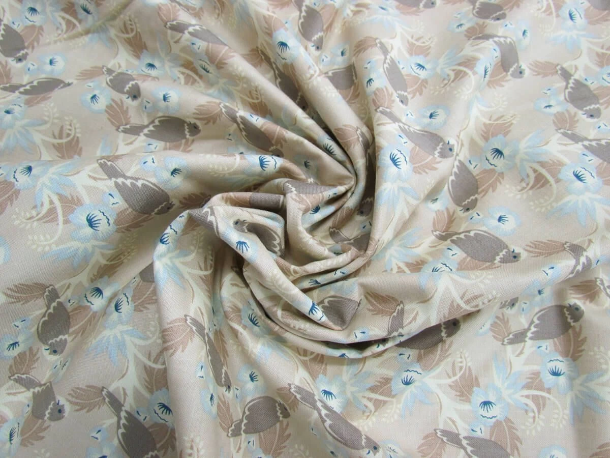 This cotton fabric has a tropical bird print, in beige and brown tones. This is a 100% cotton fabric with a lovely smooth and soft feel. This fabric feels lightweight in hand, and is suitable for quilting and patchwork projects. The woven cotton fabric is also suitable for other projects, including clothing, crafts, and accessories. This fabric is mostly opaque, with some slight sheerness due to the lightness, and a lining may be desired for some garment uses.