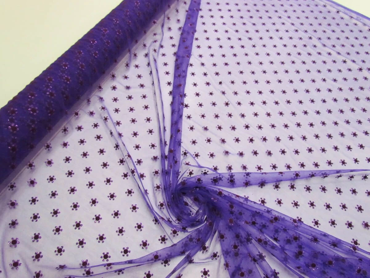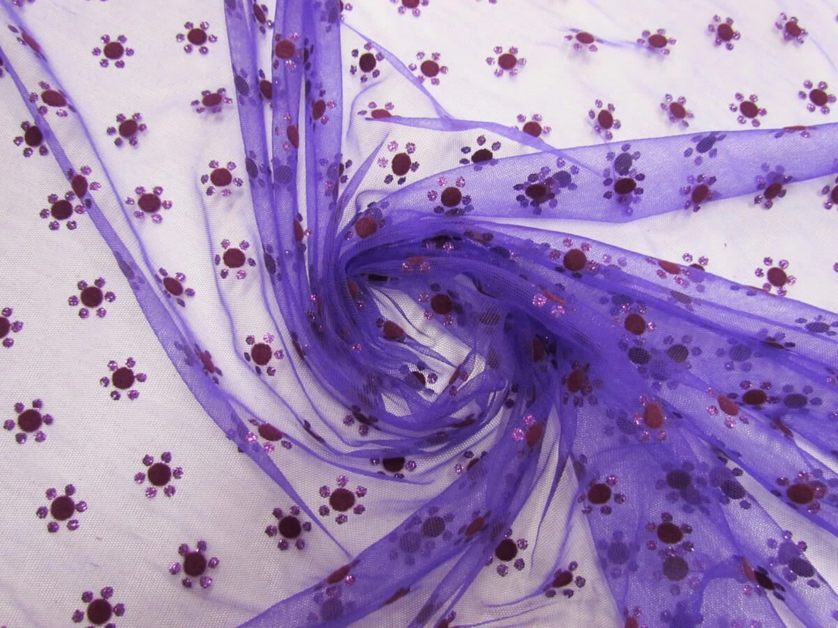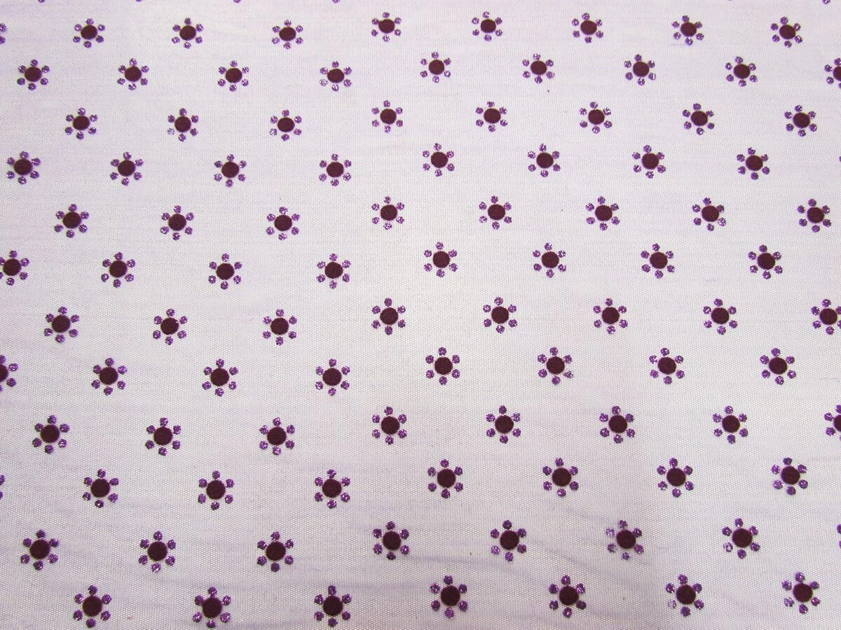 This is a pretty net fabric, with flocked and glitter details for a sparkle floral look. The center of the flowers are a velvet flocked spot, and the petals are glued glitter. This tulle like net is a very soft and lightweight dress net, which has a honeycomb net look. This net has a little structure and body, and is floaty and drapey. This tulle is for decorations, costumes, and garments. This net has slight stretch in one direction, along the weft of the fabric.