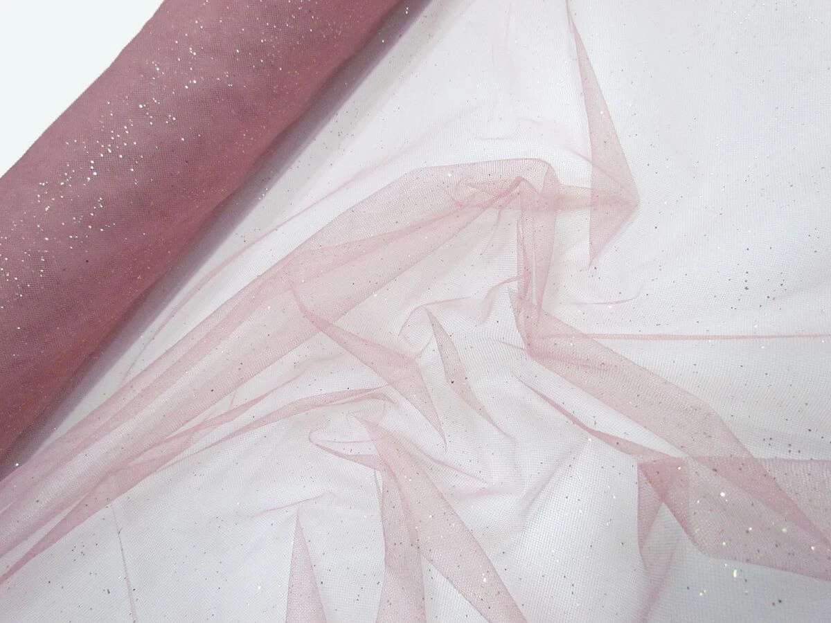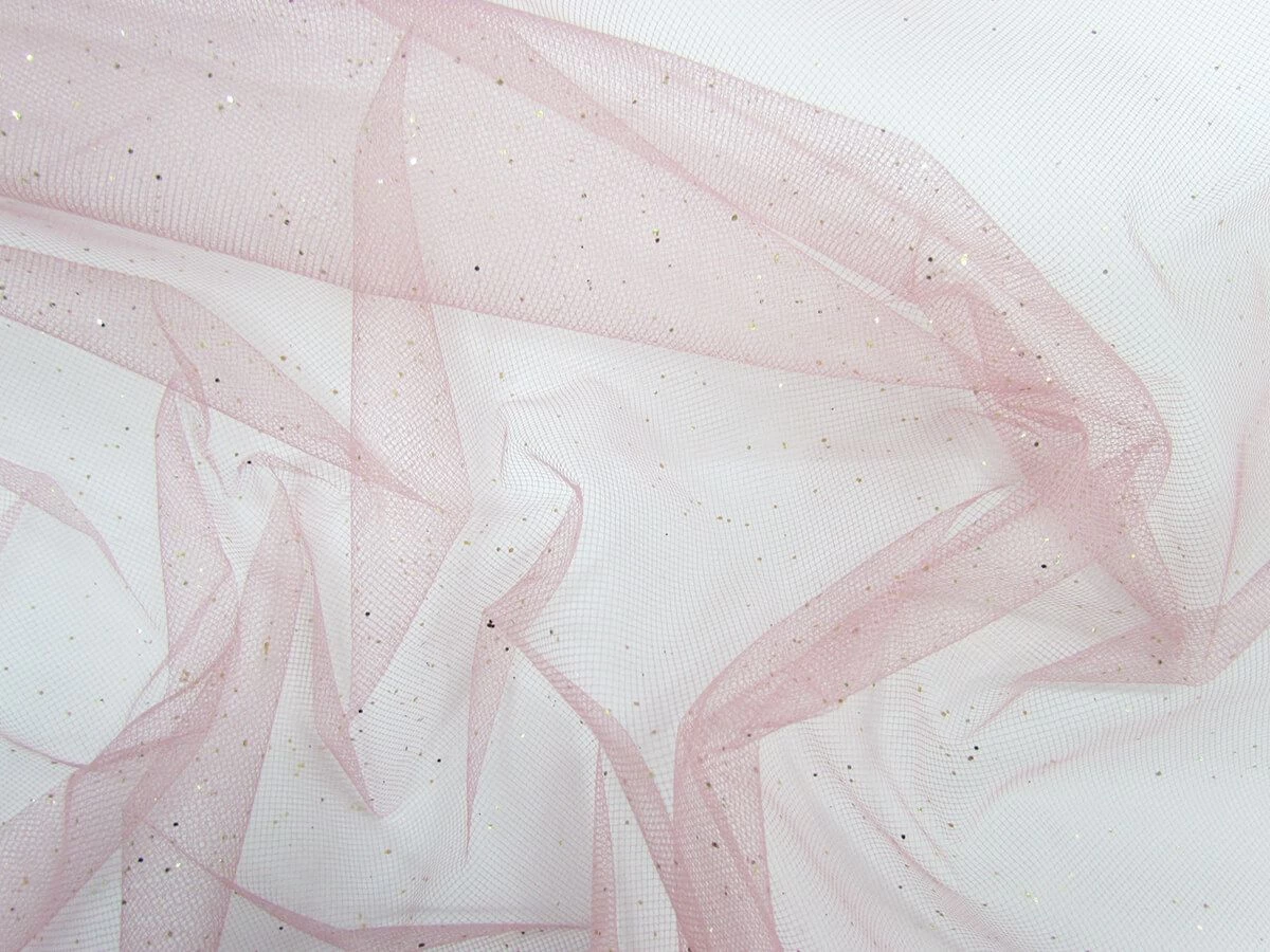 This pink net is a very light weight fabric with gold glitter throughout. This net is very sheer, with one layer barely being visible however, when this fabric is gathered or layer it has more opacity and creates a stronger colour. This net has some slight stretch but not a lot of return and is suitable for a variety of projects.