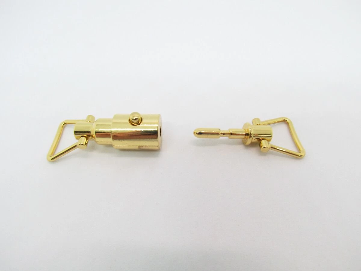 These keychain clasps in a gold colour come in a pack of two and can be opened or closed by pressing the button on the clasp which releases one of the sides. These clasps can be used in a variety of projects including bags and other similar applications.