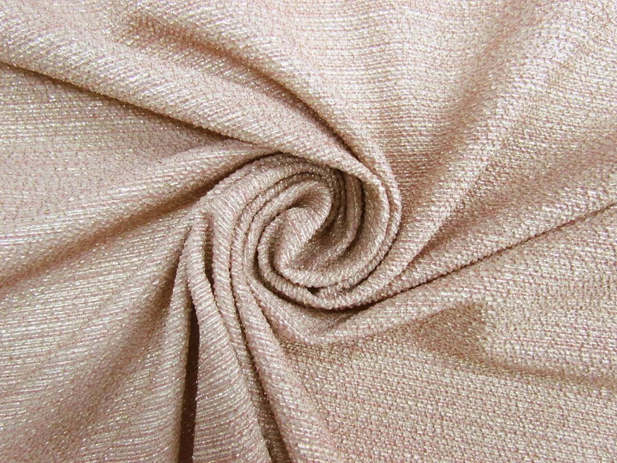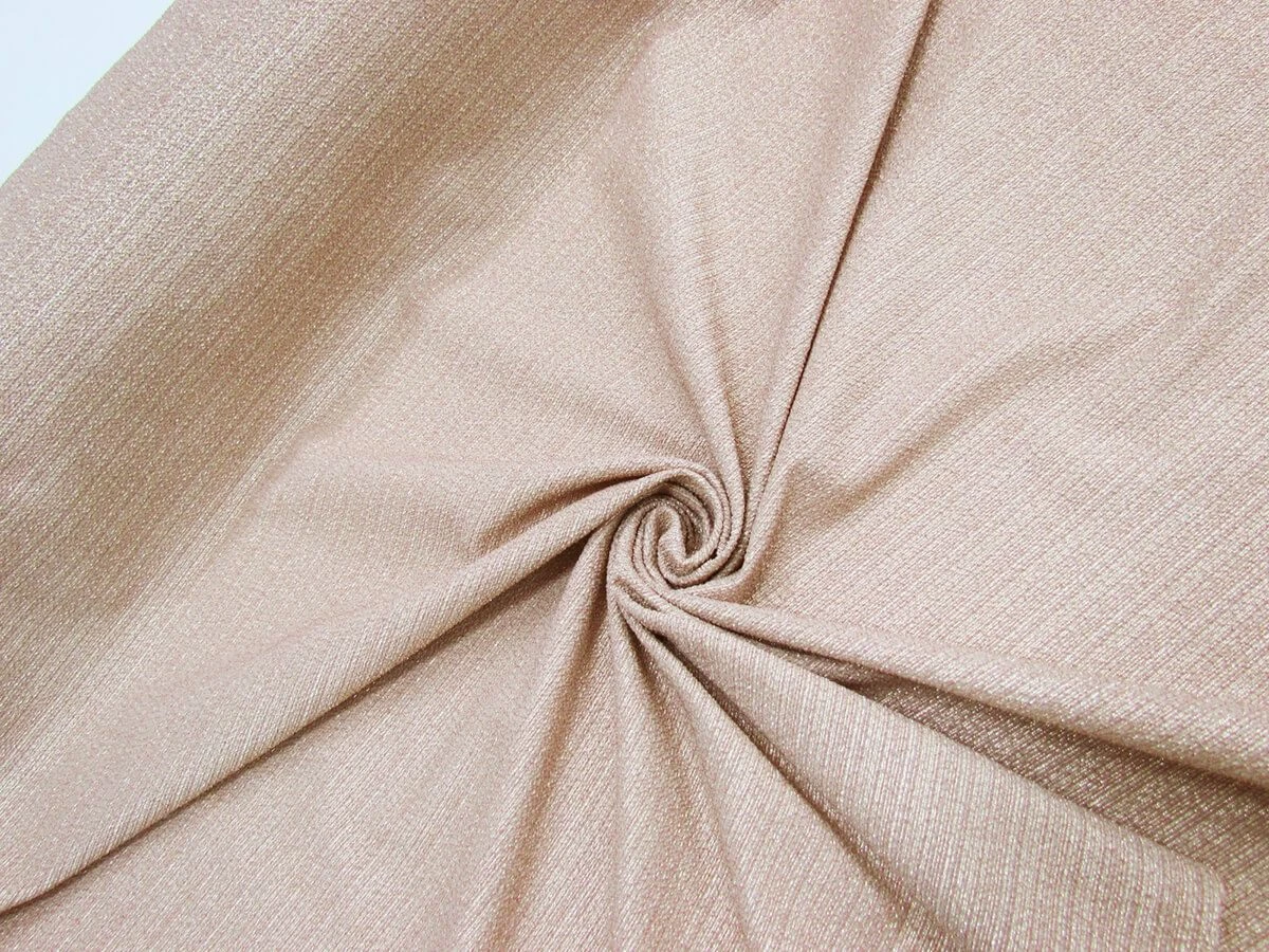 This spandex has a textured finish and pink and beige stripes running along the weft as well as gold lurex stripes. This textured spandex has a more soft finish on the reverse of the fabric to be comfortable against the skin. This sparkly spandex has light two way stretch and return, with more stretch along the warp of the fabric and is an opaque fabric that remains opaque when stretched.