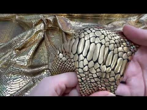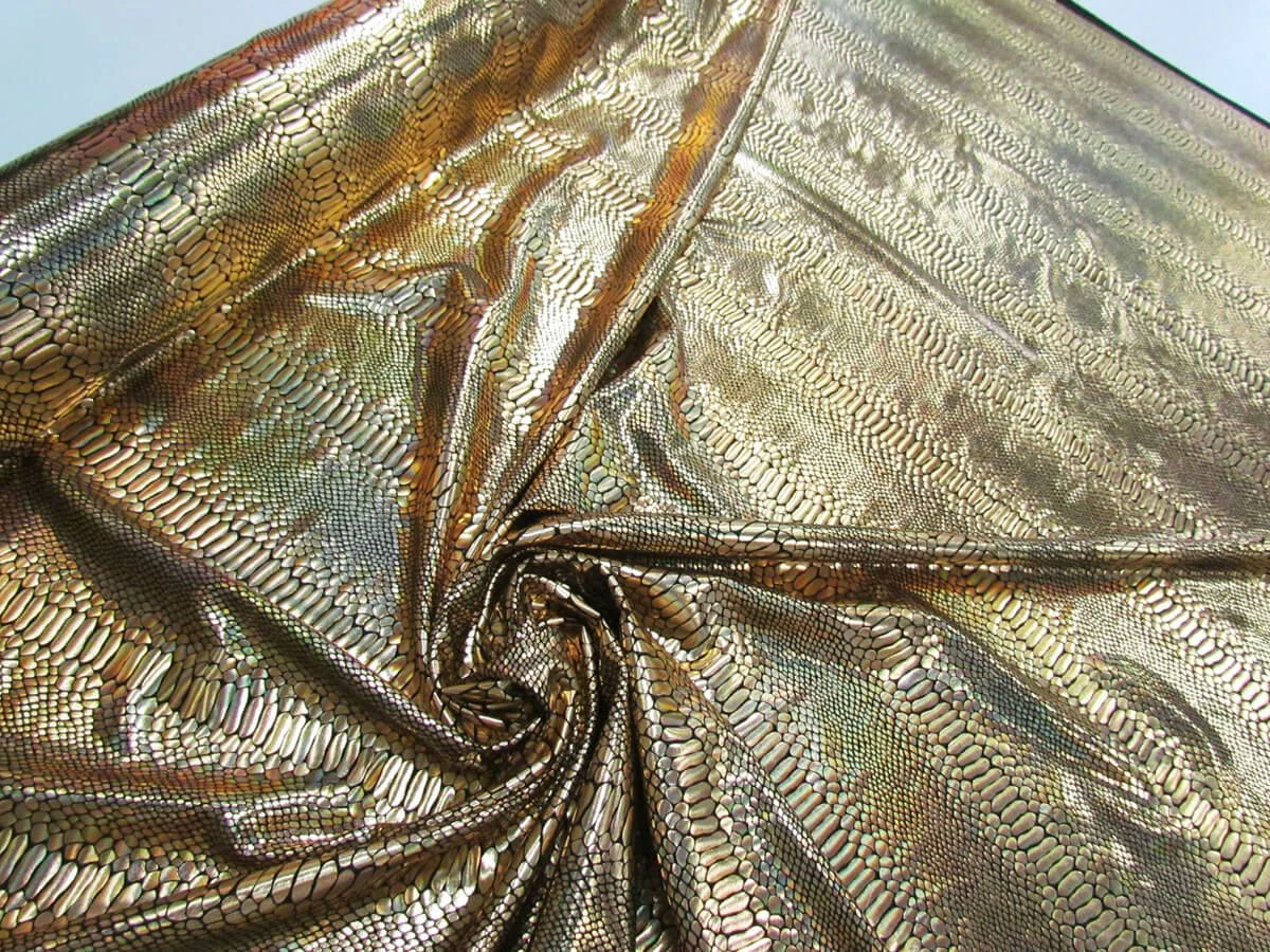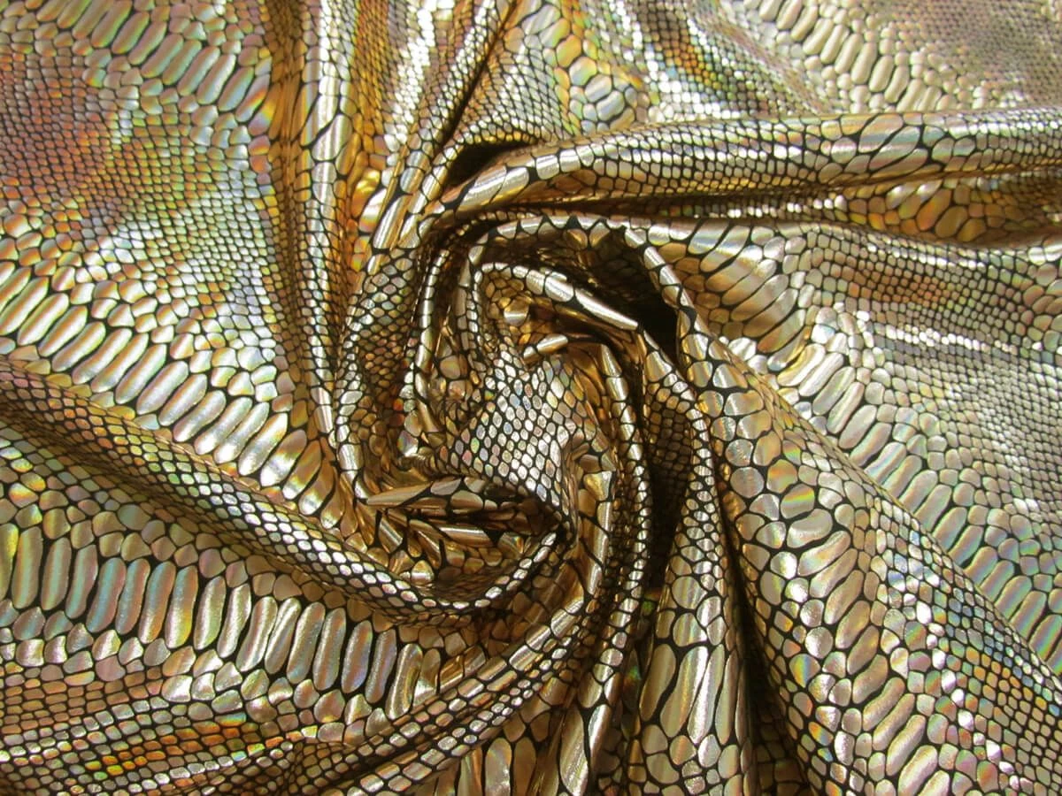 This crocodile look spandex is printed with holographic gold foil, all over a black shiny spandex. This foil printed spandex shines fantastically under light, for an eye catching look, perfect for stage, costumes, and sparkly lycra garments. This spandex fabric stretches and returns well in all directions, and is a lovely quality in look and feel. The foil does crackle a bit when stretched, particularly on the larger sections of the print.