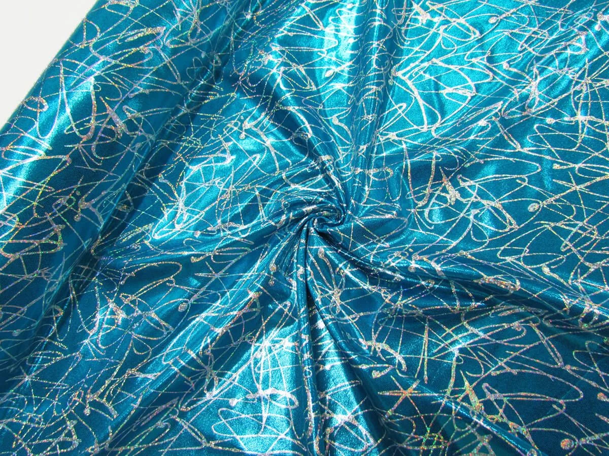 This spandex fabric has an amazing shiny effect to it with holographic details in the print. This spandex has excellent two way stretch and return and is an opaque fabric even when stretched. This holographic spandex is perfect for dance and costuming applications.